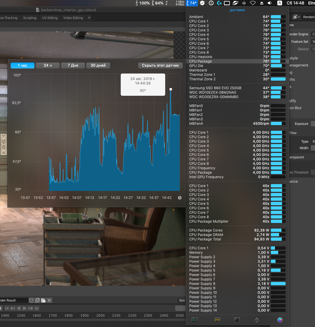 Хм мистика какая то прям... вчера вроде намного горячее было и при этом нагрузка на всю систему не такая большая как сейчас. Сейчас запустил бенчмарк (старый но все же) Heaven (нагрузка на гпу) и открыл тяжелый проект в блендере (нагрузка на цпу все ядряи потоки) Закрыта боковая крышка и заглушка на передней панели, температура примерно 75 градусов цпу и 72 видеокарта, открыл заглушку температура упала примерно на 1 градус, открыл боковую крышку температура упала примерно так же на +-1 градус. По графику видно частота процессора упала до 4ггц, странно вчера частота держалась на 4.7ггц...