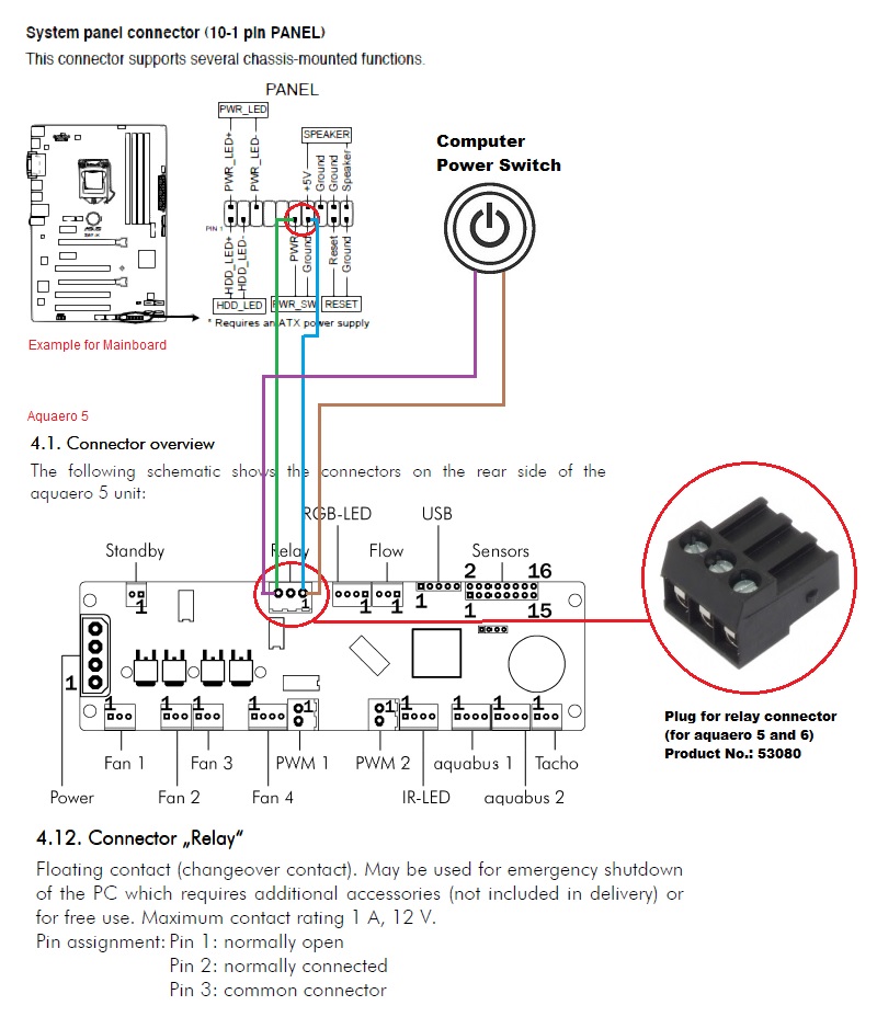 Вот что пишут на немецком форуме аквы: Обычно правильным является "переключение через 2 секунды". Если компьютер выключен, а реле находится в нормальном состоянии, вы можете снова включить компьютер. Если ПК сам включается, значит в BIOS что-то неправильно установлено или материнская плата делает что-то отличное от всех остальных материнских плат. Полная ссылка:https://forum.aquacomputer.de/berwachung-und-steuerung/105974-aquaero-6-xt-aquasuite-relais-notabschaltung/ Придется вам наверно тоже через кнопку сделать.