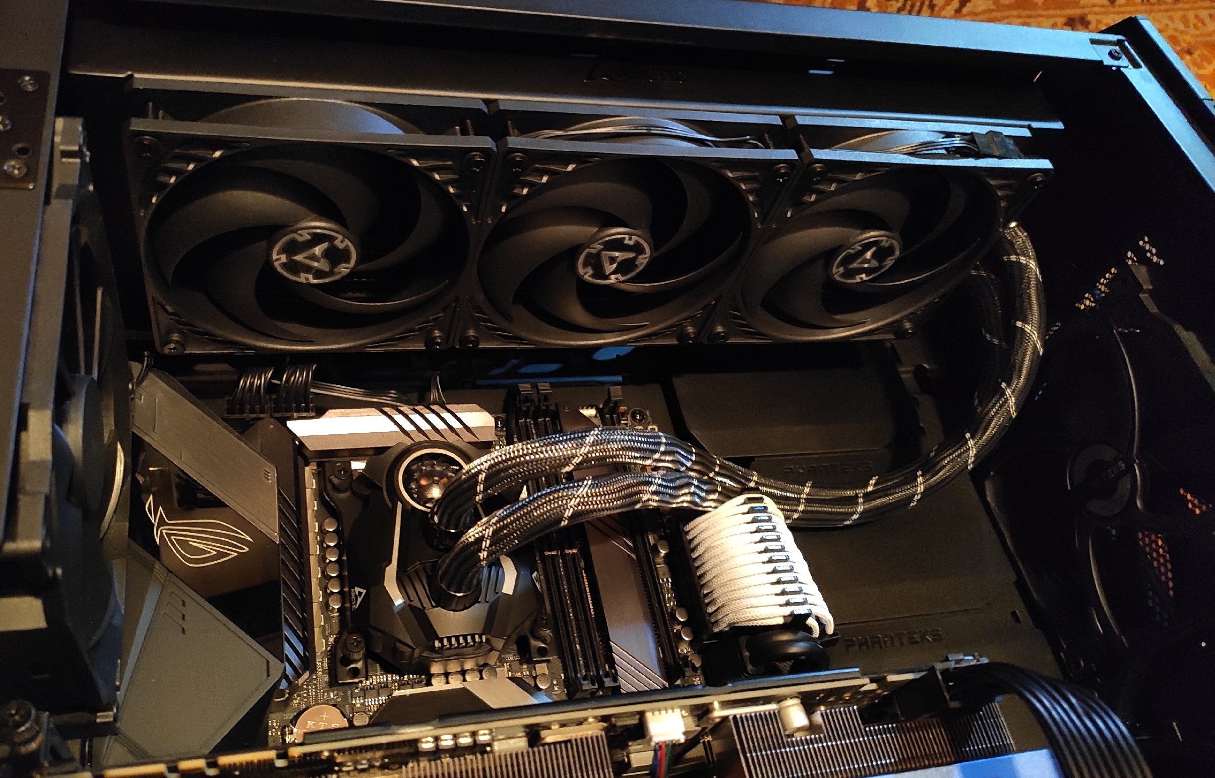 Приехал мой Liquid Freezer II 360 с амазон за 5 дней Есть пару коцек на радиаторе но всё сухо, будем наблюдать Радиатор очень легкий, хз сколько там в контуре жижи вместе с трубками наверное мл 150 Чуда особого не случилось, по сравнению с Архоном + 2шт TY140 пару градусов раздницы под айдой ЛинХ 0.9.5 не проходит на @5 1.29v температуры на самом горячем ядре 98 Но маленький вентилятор VRM бесшумный даже на 3к оборотов это факт, на 40% мощности начинаю слышать помпу, но это выше 65 градусов поставил, такая температура только в аиде, в остальное время 25% мощности настроено на графике и в играх 60-63 градусов и абсолютная тишина