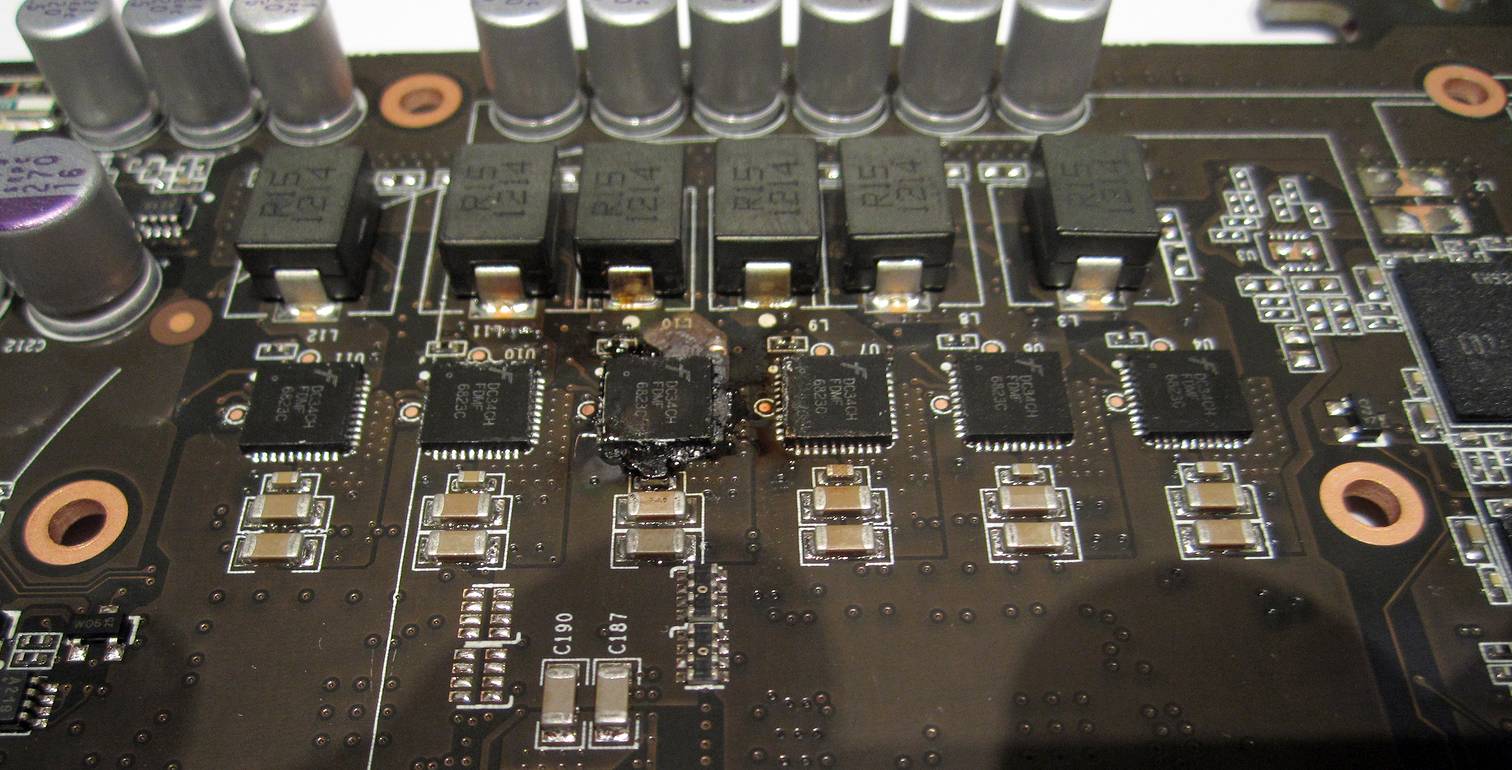 Нужно было сделать Tri-SLI из Gainward GTX 680. Питание у них было усиленное (усиленное питание от Palit!) и памяти 4 ГБ. Каждую прогнал по 5 минут, но одна вызвала подозрение - в Heaven изображение, как мне показалось, помигивало изредка. Ну, думаю, фигня. Поставил на карты водоблоки. Одна из них начала вонять через минут 5-10 после начала теста. Даже фото нашёл.
