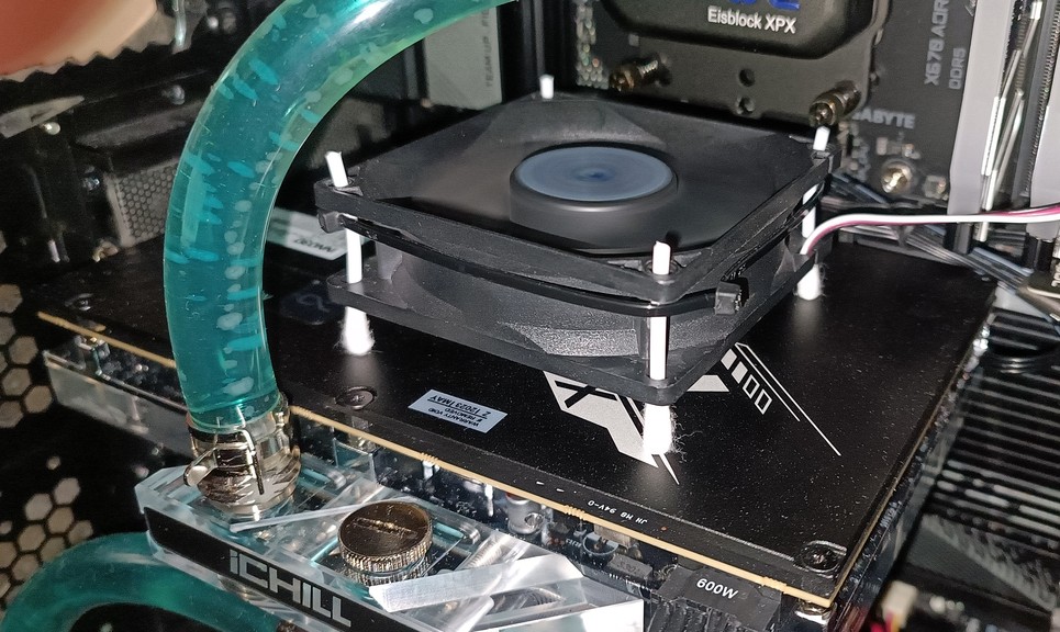 4090 = 450 ватт. 45С? Точно не при 30С воды. Не может такого быть. Минимум 50С. Уже просто интересно стало. Но в случае с 4080, да ещё с лимитом в 100%, нет смысла заморачиваться. Температуры далеки от высоких, не говоря про очень высокие. После 20 минут Port Royale, когда карта почти постоянно упиралась в 320 ватт (MSI Afterburner в графике указал макс. 110% и 330 ватт - 2+4=8?), было 55С и hotspot 68C. Память, если не ошибаюсь - 45-46С. Пластина была хорошо тёплой. А поскольку мне внутренний вид не важен (корпус закрыт и прижат к столу), я поставил на пластину 80-мм вентилятор при небольших оборотах. Почему нет