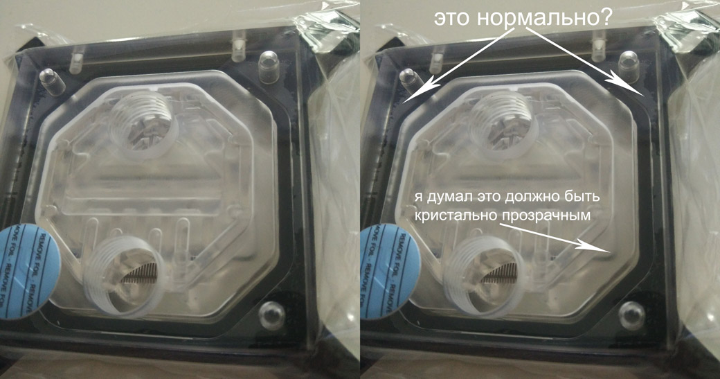 Братцы, подскажите, плиз. Пришла мне посылка ЕК, и вот что неприятное заметил: акриловые детали изнутри мутные, как будто масляные чтоли - на водоблоке цп EK Supremacy EVO Nikel-Plexi и на помпе EK X-TOP Revo D5 PWM Plexi. Сфоткал как получилось, но вживую довольно сильная разница по сравнению с кристально чистыми рекламными фотографиями на сайте производителя. Вот например резервуар из того же акрила действительно кристально чистый, аж голыми руками мацать не хочется. А еще на акриловом топе помпы отчетливо видны грубые следы ЧПУ на спиралевидном канале и тупо какая-то грязь в месте, где металл помпы с плекси-крышкой соприкасается.