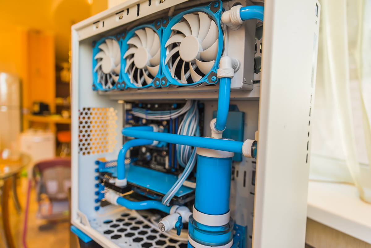 Друзья мои,здравствуйте!!!!!! Пока в процессе доработок ,будут еще фотографии. Процессор на всех ядрах холодно ,21-22. Получилось удачно. Много прочитал,много послушал умных людей Делал 1 раз в жизни,думал из мягких..Передумал сразу,только трубки. Корпус т 5 Термалтейк, сделал дизайн под свой вкус. Будут еще доработки,дополнения, детали. свет,и. т..д