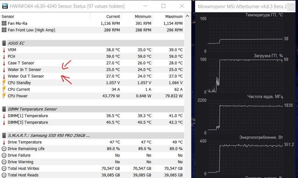 У меня нет датчиков замеры разницы воды и т.д. Я говорю только про температуры железа. То какая разница между те., воды и железа = мне совершенно все равно. Но если вспомнить 1080Ти, то разница вода/видюха меньше 10 градусов у меня было(100%!!). Я проверял темпу воды по жопе радиатора, 32-34 градуса вода, 39-41 градус видюхи(1080Ти)