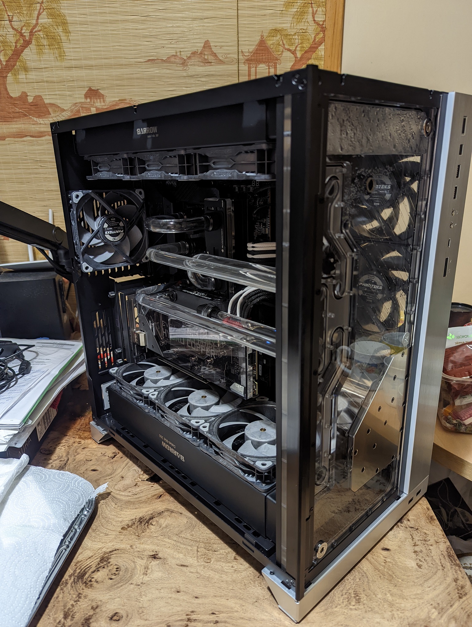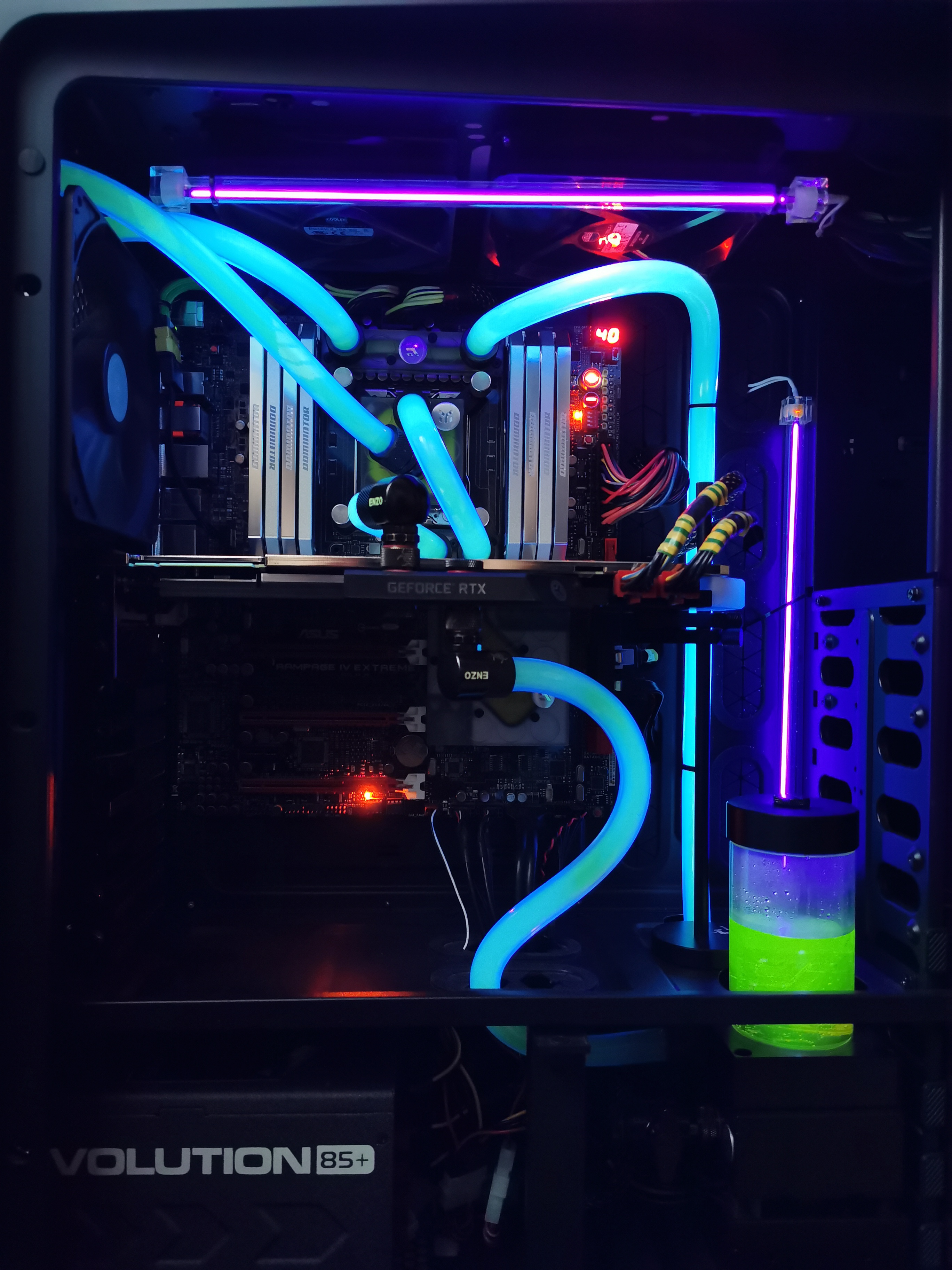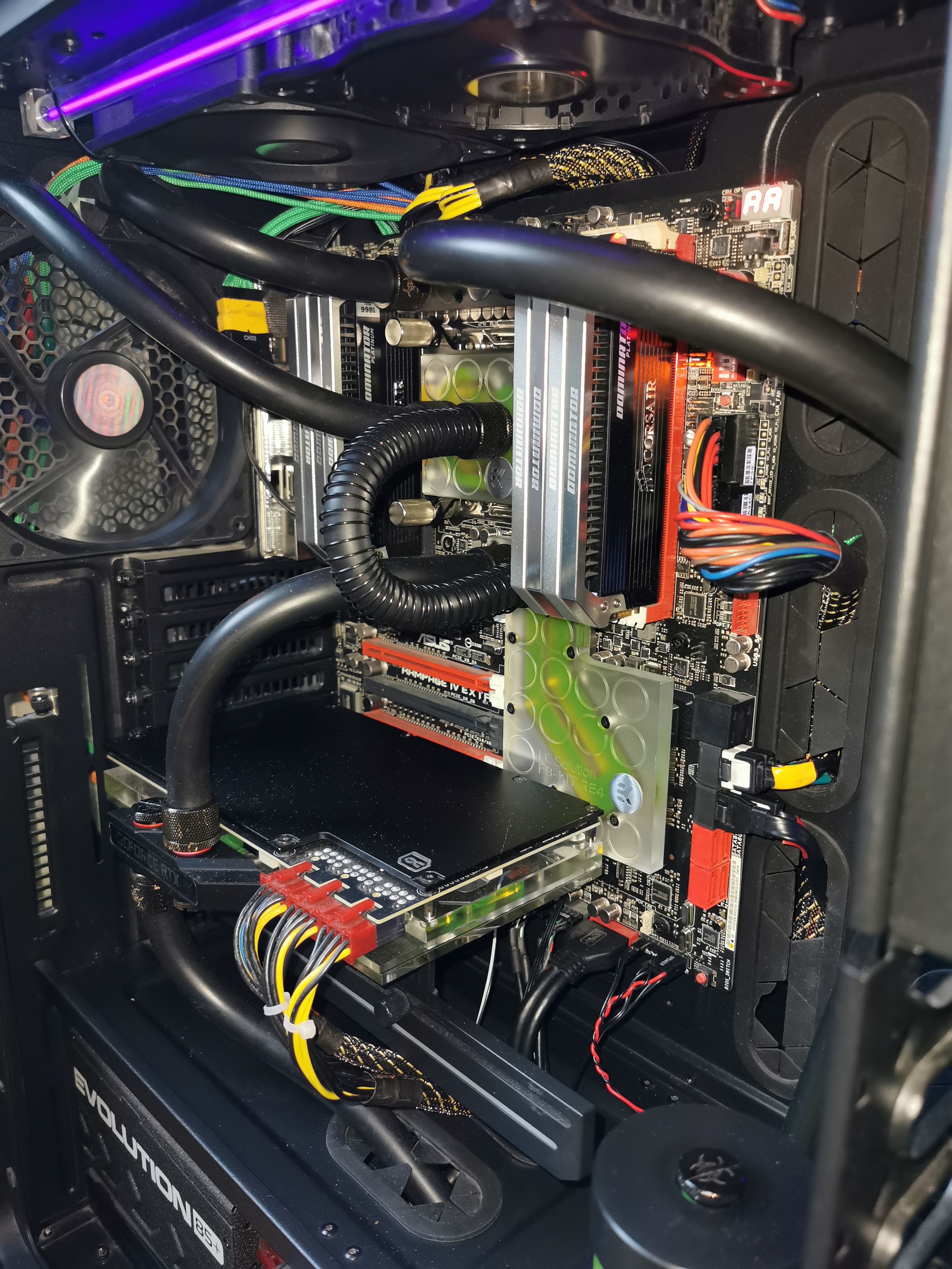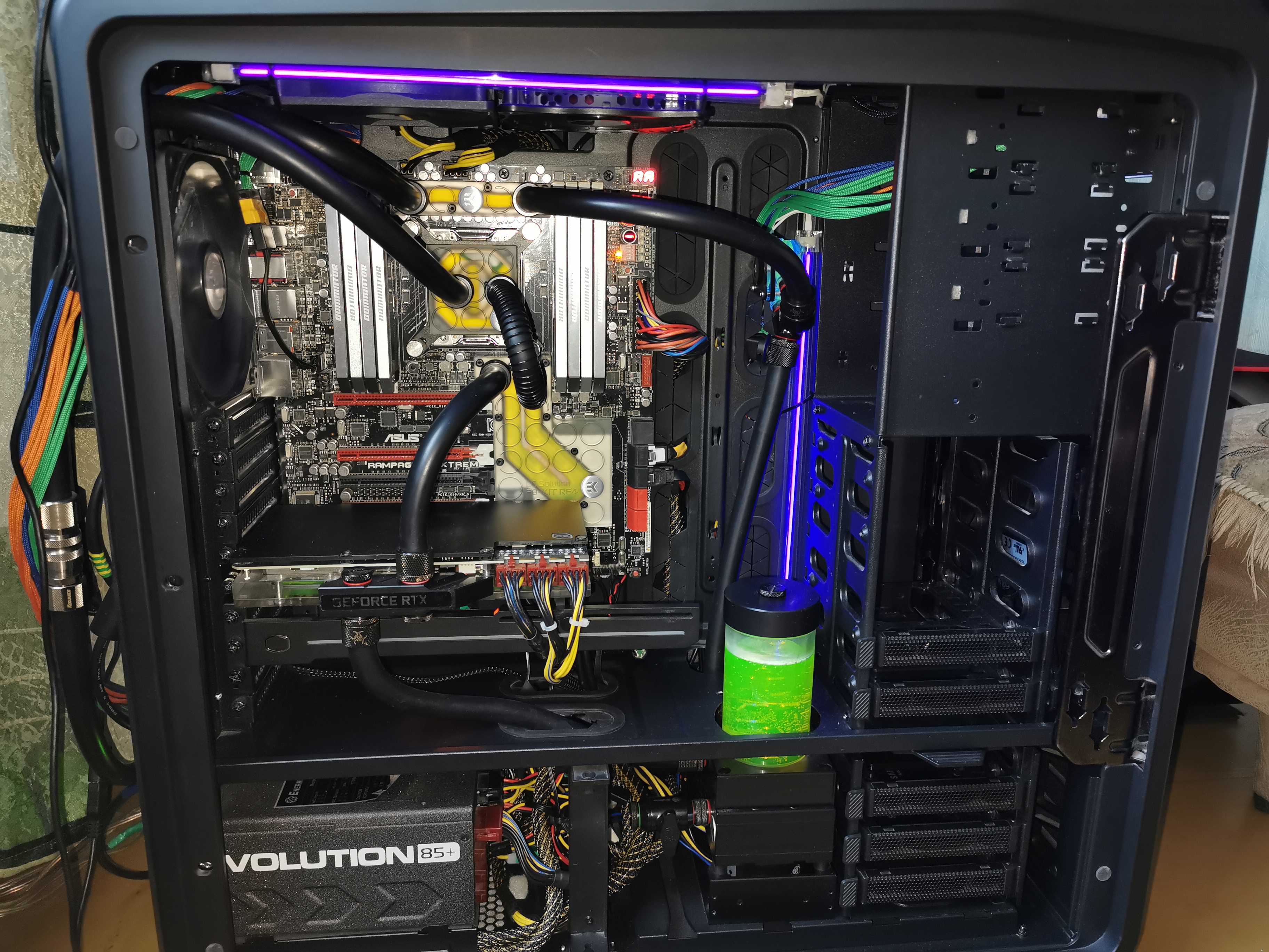 Водоблок CPU - EK-FB ASUS ROG R6E RGB Monoblock - Acetal+Nickel Водоблок GPU - EVGA Hydro Copper Помпа - EK-XTOP Revo Dual D5 PWM Serial Резервуар: EK-RES X3 150 Lite Радиатор - 2x EK-CoolStream XE 480 + Black Ice Nemesis GTS 240 Фитинги - EK-ACF 12/16мм, 45, 90 градусов, поворачивающиеся удлинители M-M, Х-разветвитель, шаровой кран, затычки и пробник температуры в виде затычки. Диаметр шлангов (внешний/внутренний), материал - EK-Tube ZMT Matte Black 16/11мм Модификации - В корпусе выломана корзина для жестких дисков. Корпус - Phanteks Enthoo Primo