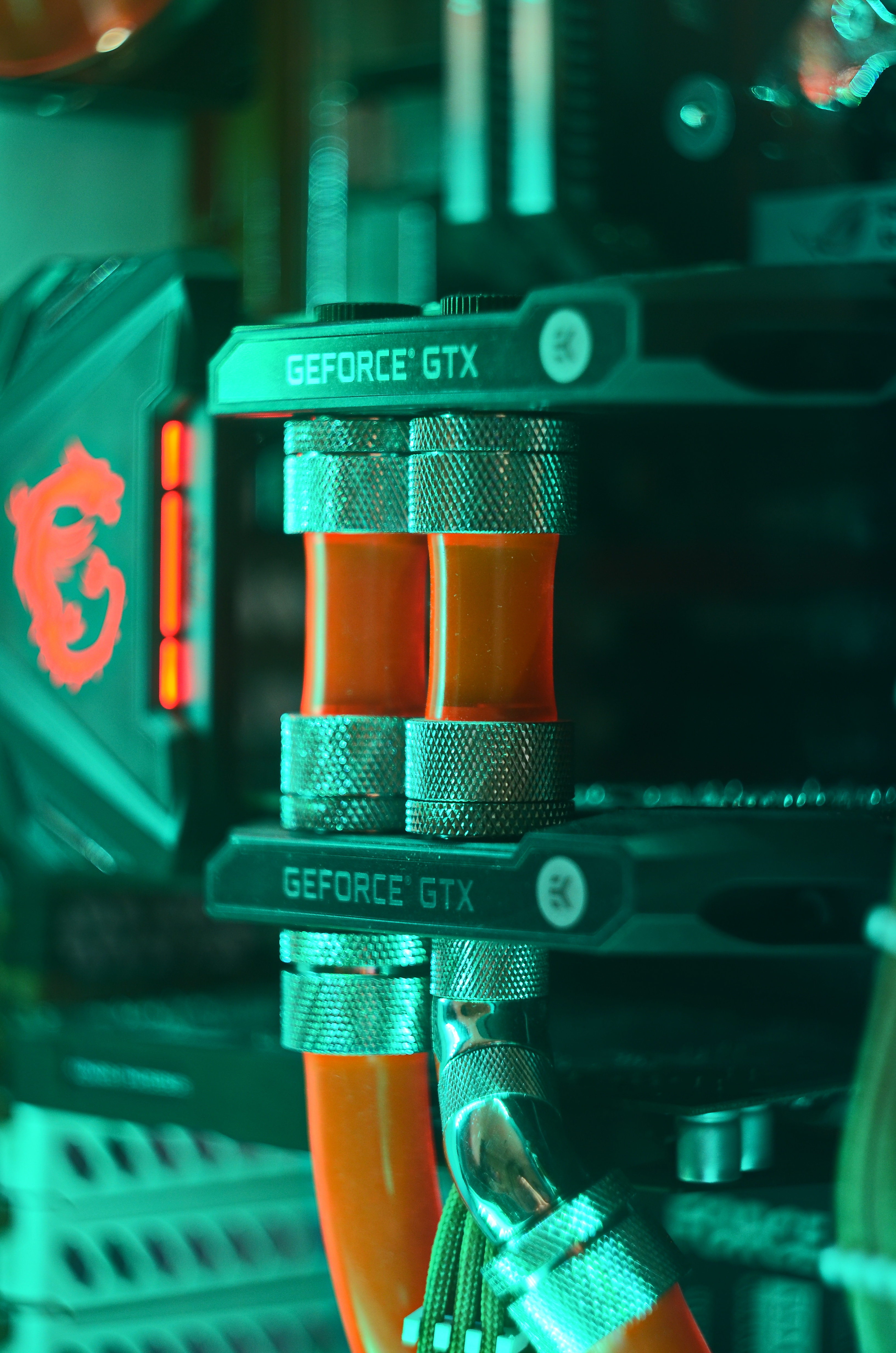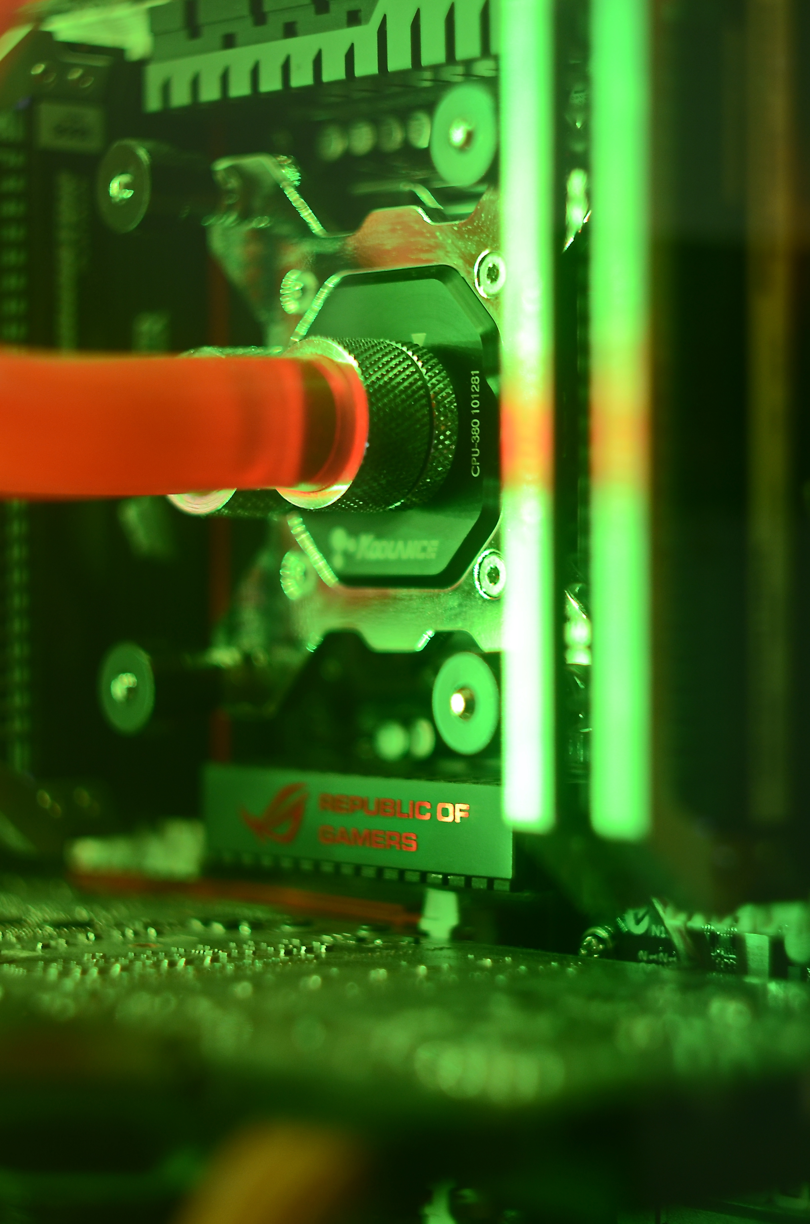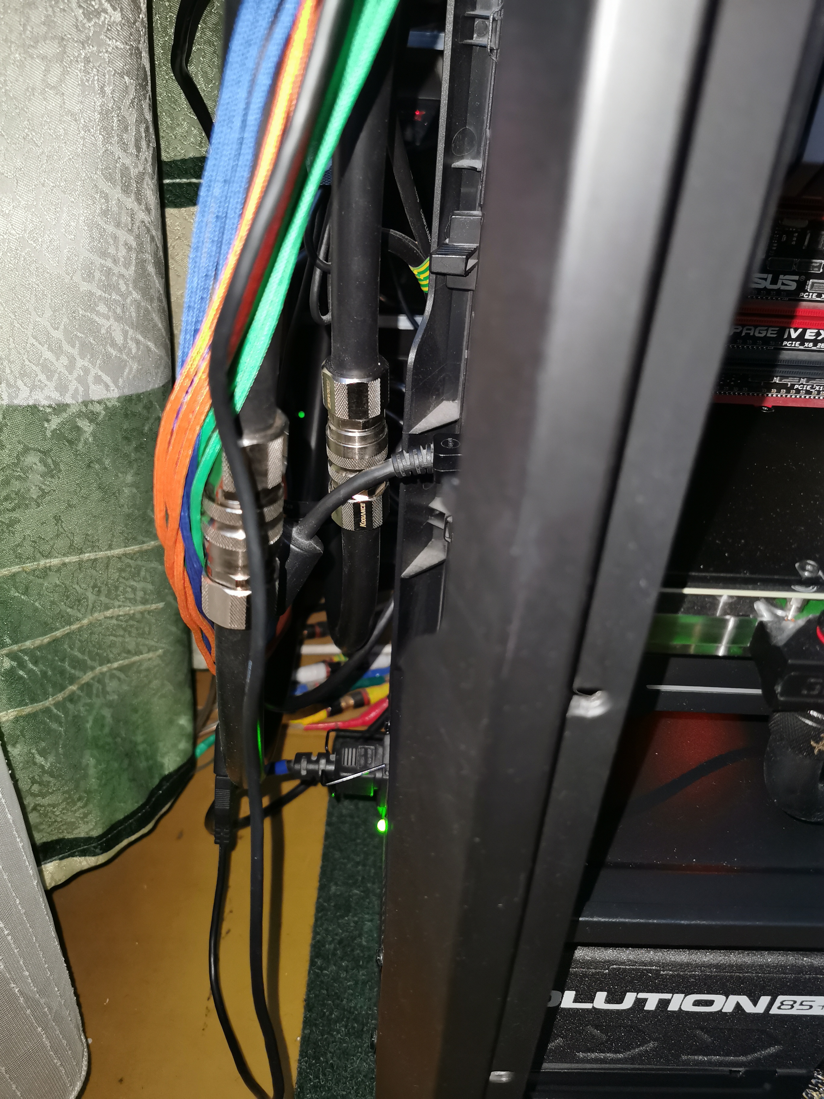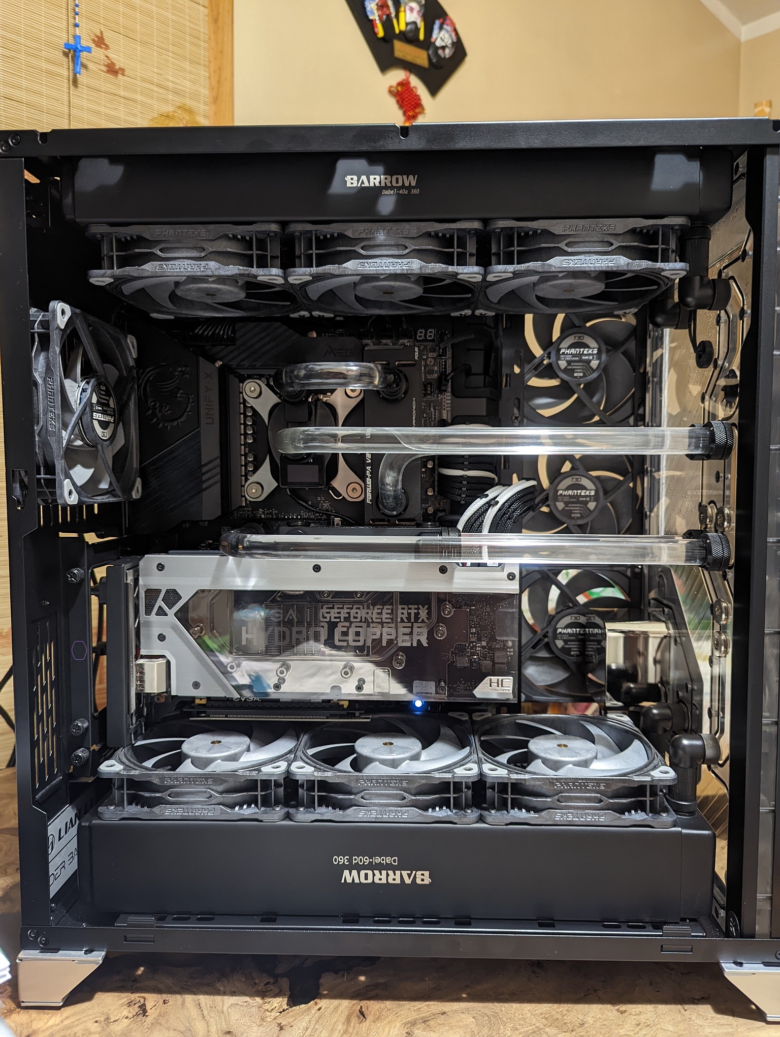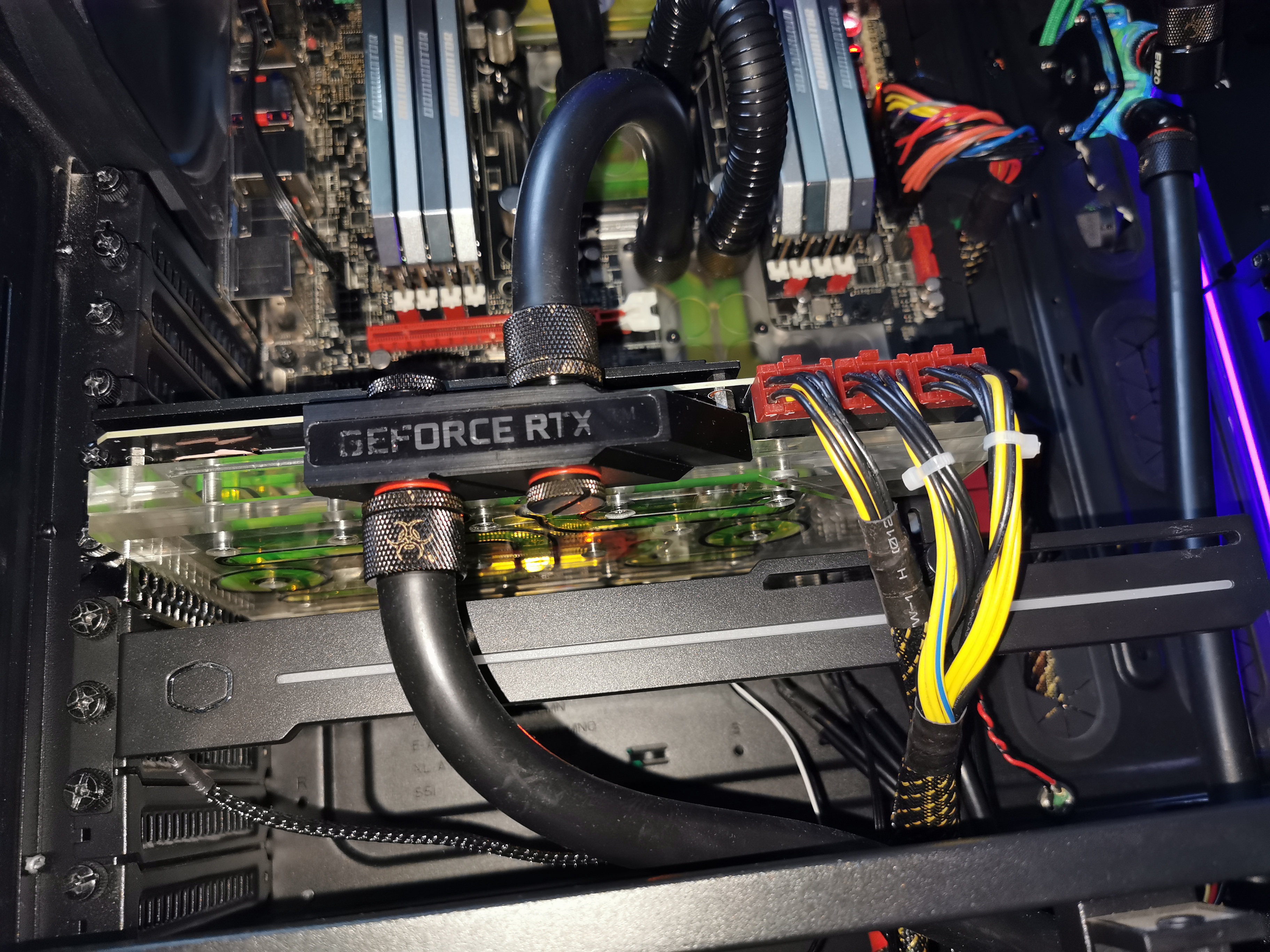 Водоблок CPU - EK-FB ASUS ROG R6E RGB Monoblock - Acetal+Nickel Водоблок GPU - EVGA Hydro Copper Помпа - EK-XTOP Revo Dual D5 PWM Serial Резервуар: EK-RES X3 150 Lite Радиатор - 2x EK-CoolStream XE 480 + Black Ice Nemesis GTS 240 Фитинги - EK-ACF 12/16мм, 45, 90 градусов, поворачивающиеся удлинители M-M, Х-разветвитель, шаровой кран, затычки и пробник температуры в виде затычки. Диаметр шлангов (внешний/внутренний), материал - EK-Tube ZMT Matte Black 16/11мм Модификации - В корпусе выломана корзина для жестких дисков. Корпус - Phanteks Enthoo Primo