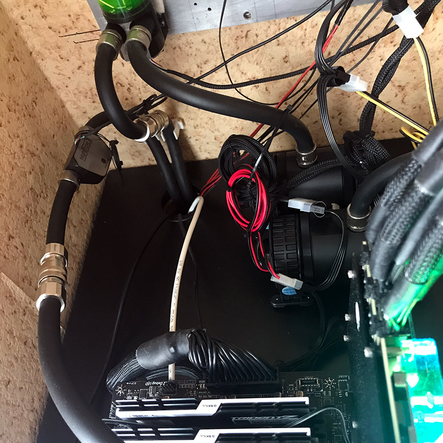 Скальпированный 8700k на ЖМ в z170i pro gaming + 1080ti. Всё это под кастомной водой на ДВУХ 240мм радиаторах в корпусе объёмом 18 литров. P.S. контур собирал буквально из того, что было. Трубы зашкварные.