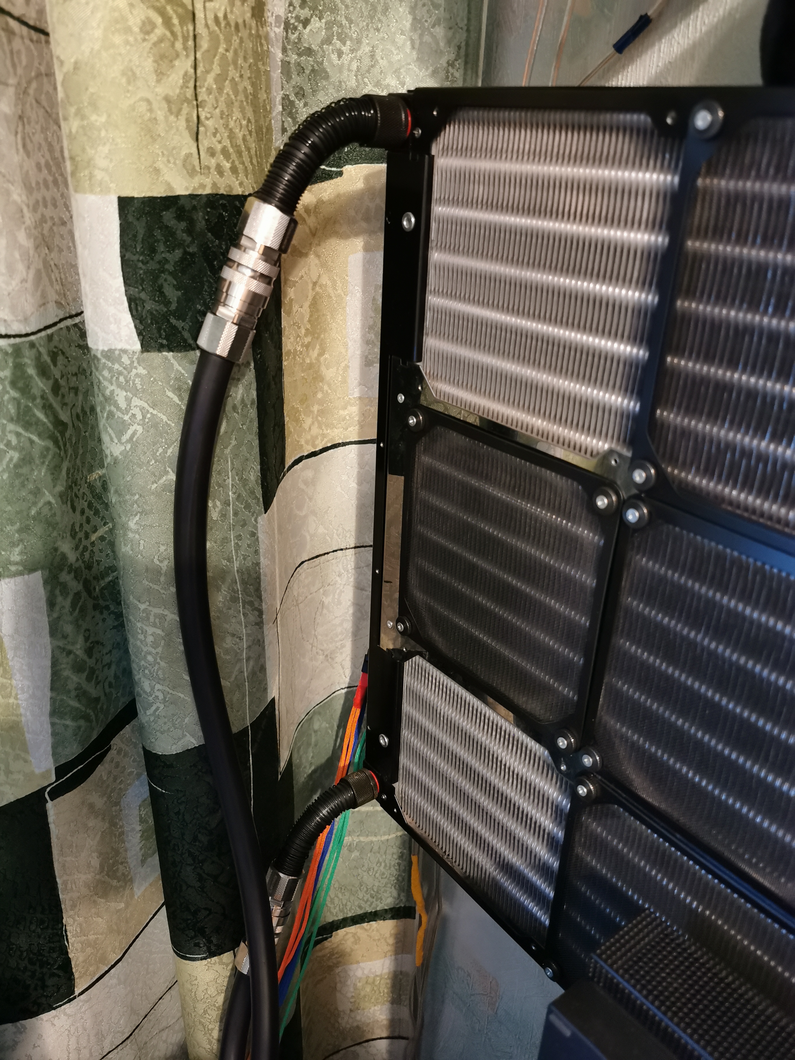 Немного разряжу обстановку... основная информация в "Профиле", только дополню про свой "колхоз": 1. Полностью модульная конструкция, три "отсека": опен-стенд, резервуар+помпы, радиатор. 2. Используется 5 шт. БРС-ов, для быстрого демонтажа необходимого "отсека". 3. Используется 4 шт. термо-датчиков: температура в комнате, на лоджии (в районе поступления воздуха), вход/выход из радиатора. 4. На радиаторе (MO-RA3 420) 2 шт. краников, для удобства при профилактических работах. 5. Опен-стенд отсоединяется за пару минут для профилактики (чистка, замена/добавление/изменение составляющих). PS: единственный вентилятор работает на 600 об/мин для сдувания пылинок с бэка ускорителя.