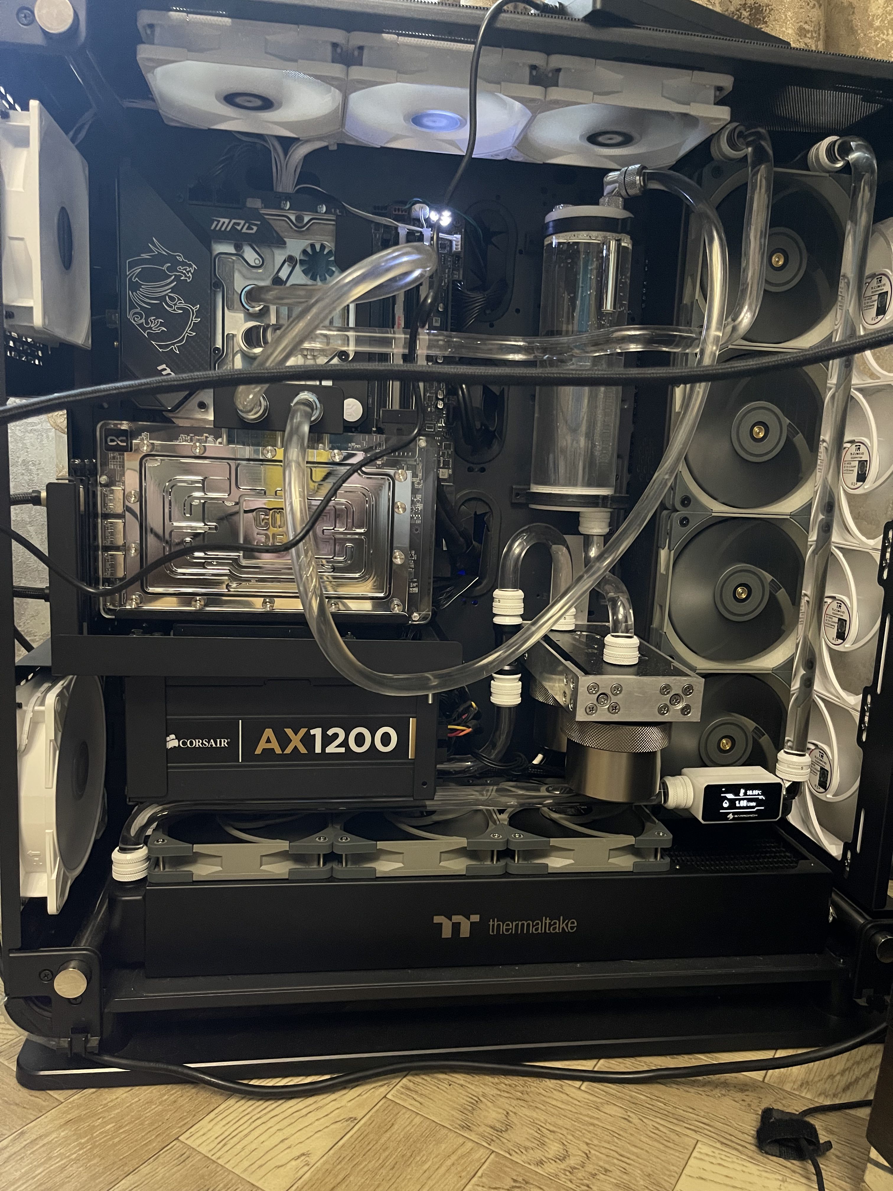 состав 2шт последовательно MCP655 (D5) в тесте выставил максимум 4800-4900 оборотов на каждой 2шт 480 радиатора EK CoolStream RAD XTX 480 + Thermaltake Pacific CL480 с вентиляторами на максимум 1900 оборотов Thermalright TL-C12-PRO-G (8-ой вентиль не влез) водоблок проца 14700к штатный MPG Z690 CARBON EK X водоблок собственно alphacool core 5090 palit game rock шитая в ОС