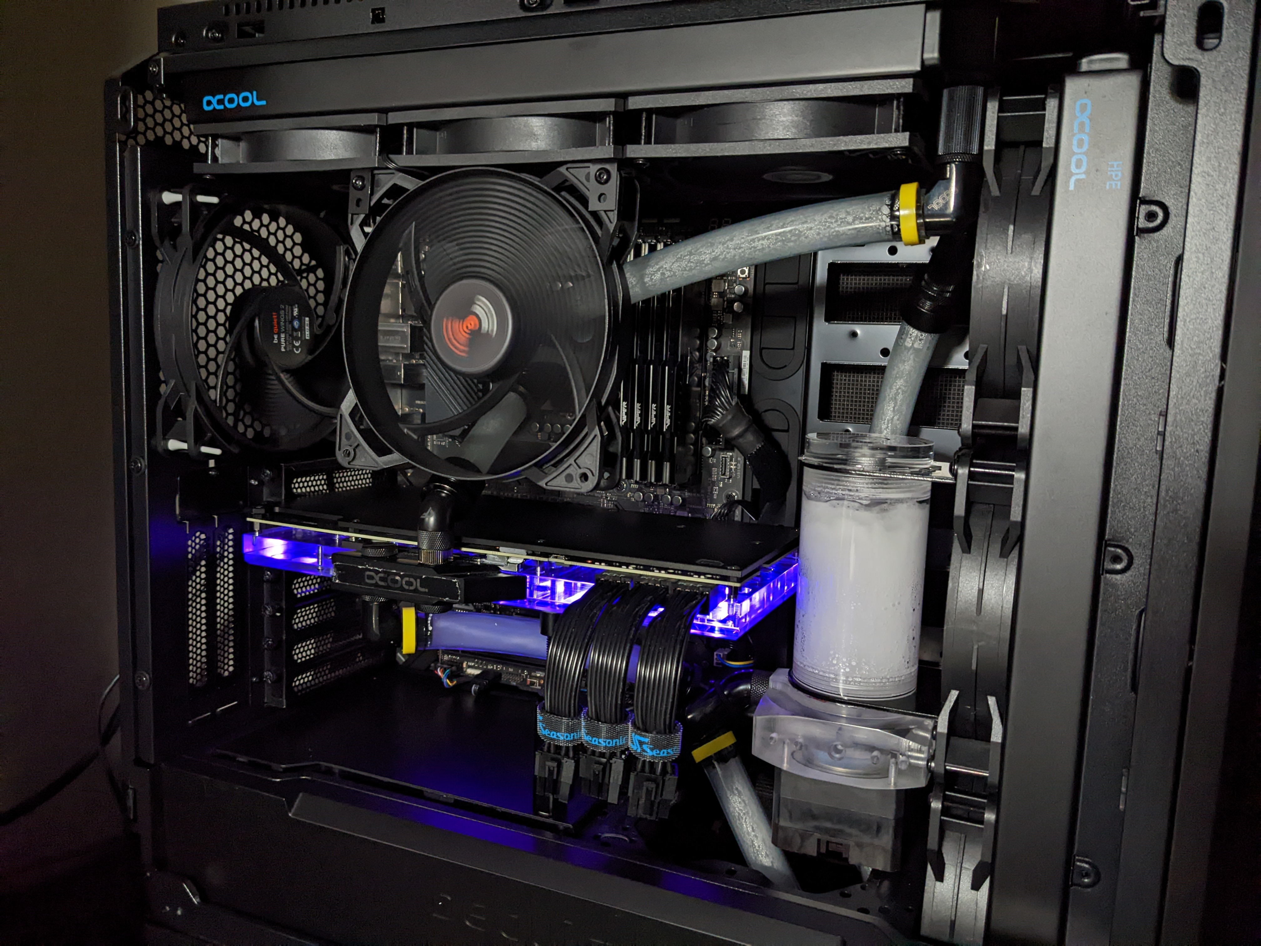 Case: Be Quiet Silent Base 802. CPU: EK Supremacy Evo Acetal+Nickel GPU: Alphacool Aurora GPX Eisblock + Acetal Terminal Cover Top rad: 360mm Alphacool NexXxoS ST-30 full copper Front rad: 420mm Alphacool NexXxos HPE-30 full copper Pump: Laing DDC-2CVTP 18W/ 600 l/h (DC controlled) Top+reservoir: Alphacool Eisbecher DDC 150mm Temp sensor: Alphacool Eiszapfen G1/4 Inline Temp Sensor Fittings: Alphacool Eiszapfen 13mm ID 19mm OD Compression Fittings Alphacool Eiszapfen 13mm ID 90' Revolvable Barbed Fittings Barrrow 45' Rotary Adapter Fittings CoolForce (Nanoxia) 60', 30' Angled Rotary Fitting Adapters Tubing: ModMyMods 13mm ID x 19mm OD Flexible PVC Tubing, Crystal Clear Cooling liquid: Alphacool Tec Protect 2 Clear Thermal grease: Thermal Grizzly Kryonaut Extreme (CPU) Alphacool Subzero (GPU) Изначально была мысль верхний рад установить фитингами к задней стенке, чтобы минимизировать присутствие шлангов насколько это возможно. И получился бы рад в промежутке видео/ ЦП. К сожалению, в этом случае установка тылового вентилятора становилась невозможной. А по факту это единственный работающий на вдув. Второй стоит снизу, но там доступ сильно ограничен нависающей помпой и впускными/выпускными фитингами. Шланги 19/13 настолько жесткие, что проще, наверное, работать с хардлайном. Тьюбинг в данной сборке это был просто ад. Жду заглушки для панели корзин ssd. Эстетика с шлангами, конечно, сомнительная. Но поскольку это все закрыто глухой панелью, можно смириться. Производительность по температурами 3080Ti очень радует. Ради нее, собственно, все и затевалось. Разница между тем что сейчас и что было под Альфовской AIO Eiswolf 2 все с тем же радиком что сейчас на вехней панели висит, более 20 градусов по ГП и 10-12 по видеопамяти. С водоблоком ЦП какие-то нелады по производительности. Уже 5 раз пересобирал в различных конфигурациях разгонных пластин и впусков-все равно не ниже 90 градусов в стресс-тестах на 9900K при 200+ Вт. Возможно, с недоприпоем нелады.