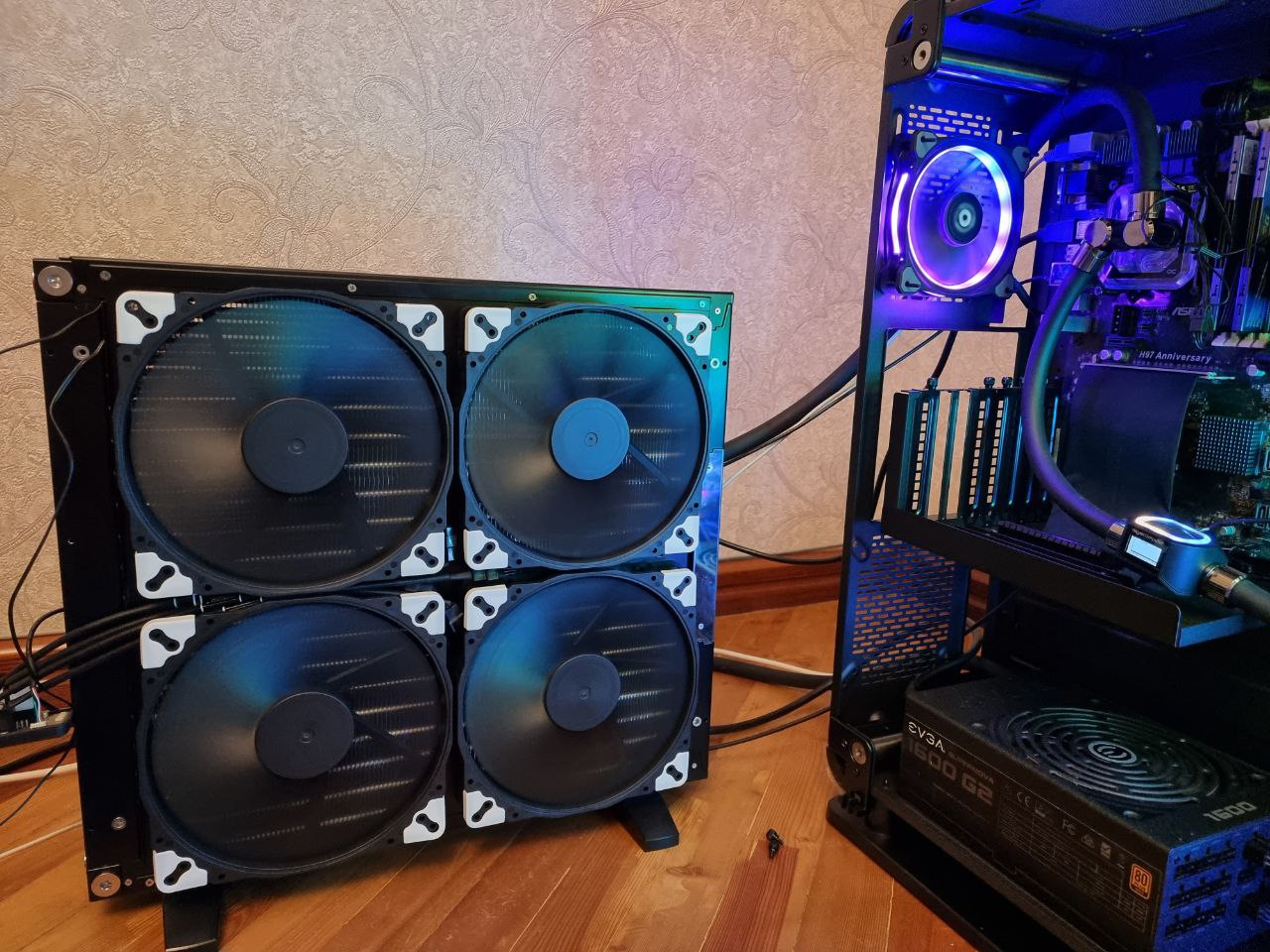 На днях собрал контур в свежем Lianli evo xl. Получилось симпатично, а главное теперь комплектуху по типу дисков и вк можно легко менять/тестировать. А то за последние полгода купил два m2 диска и что-то так впадлу было все перебирать, что они так и пролежали в столе до переезда в новый корпус. Собирал в перевернутом виде, так как комп слева стоит, помпу спрятал за задней крышкой.