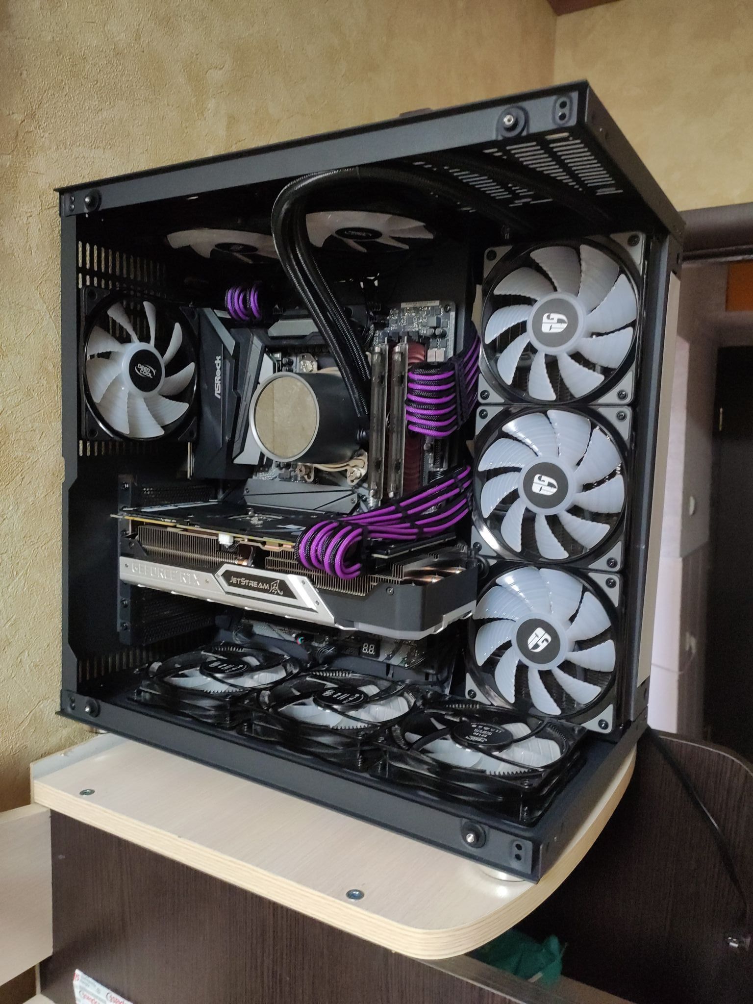 В корпусе это так выглядит, сначала вентиляторы на выдув, потом радиатор СВО, стенка корпуса с дырками. Все горячее выходит из корпуса. Приток свежего воздуха идет от 200 мм на морде или 2*120, 2*140. Верно?