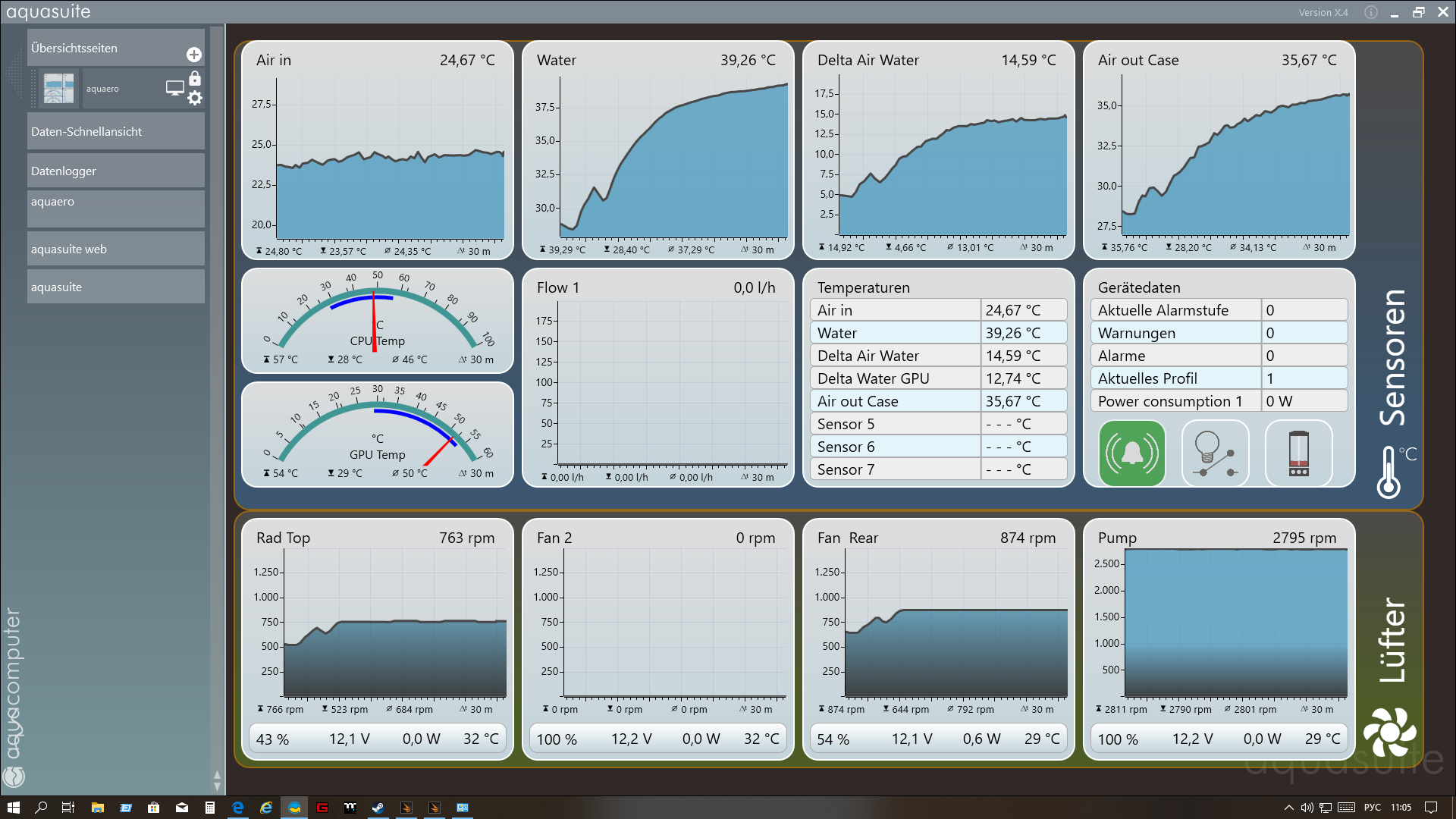 Вот расклад на скрине (типичная игровая нагрузка) Оба датчика Air out показывают температуру такого же порядка как температура жидкости. Отклонение не больше 0,1 градуса. "Левый" чуть холоднее, и это действительно так потому что правый рад стоит в контуре первым и отдаёт тепло первым, левый рад получает уже более охлаждённую жижу и соответствено и воздух на его выходе прогревается чуть меньше. При этом есть датчик Top exhaust который стоит в заднем отсеке под самой крышей, у входа в верхний вытяжной вентилятор. Вот там самое пекло, что как раз логично - туда поднимается нагретый обоими радами воздух и радостно вытягивается вытяжкой (PSU exhaust дышит воздухом не сообщающимся с радиаторным отсеком, поэтому его показания не имеют отношения к вопросу). А как показывают оба датчика Air out left/right, никакого регистрируемого подогрева одного рада другим нет.