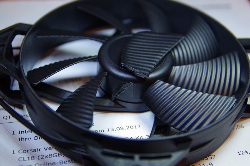 Дефект коробки в месте расположения помпы-вентилятора. Видимо, помпа помогла. Но каким образом? Она там болталась? Почему вентилятор не огорожен? Вопрос задан производителю (указан в паспорте для РФ - info@be-quiet.ru)