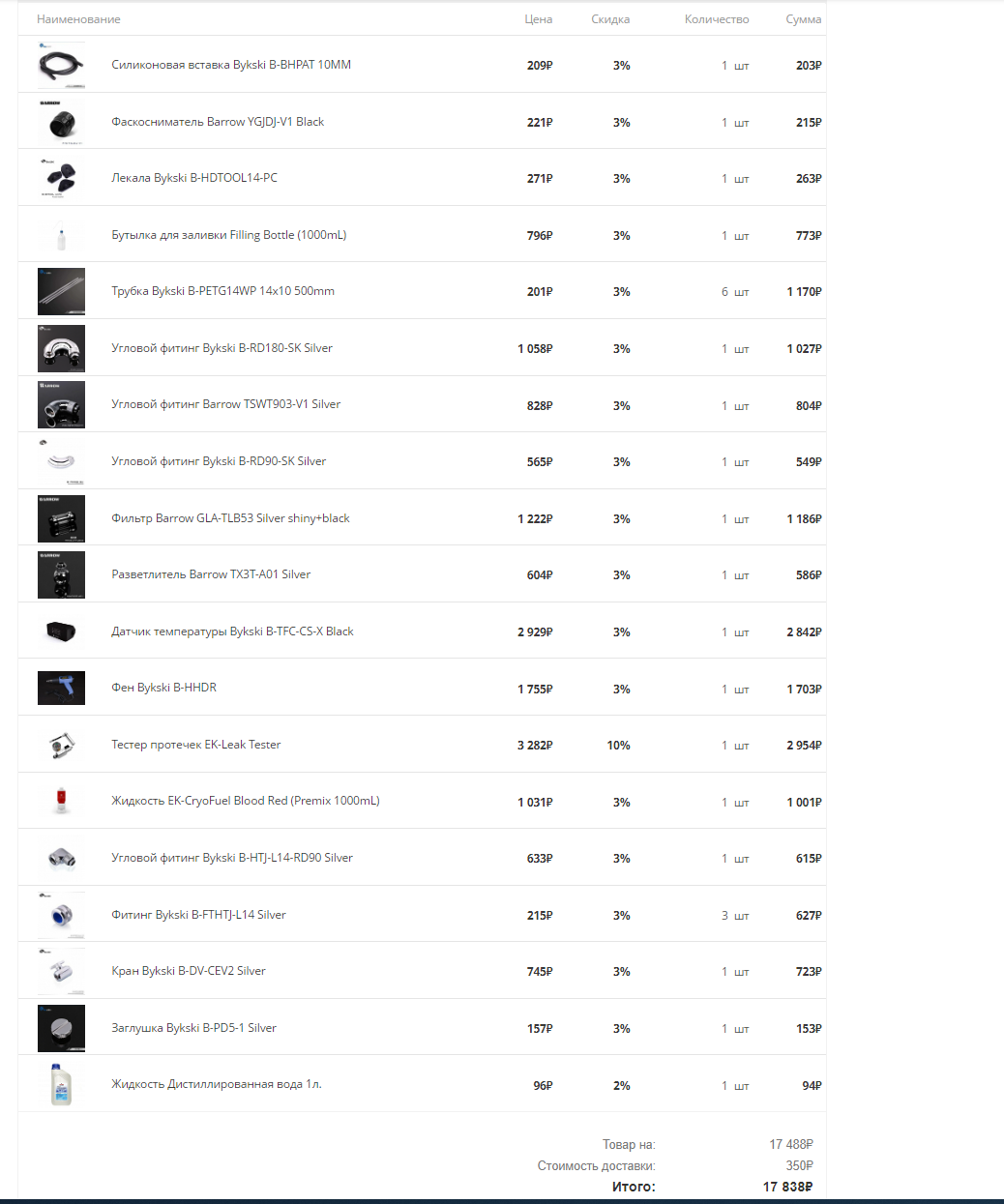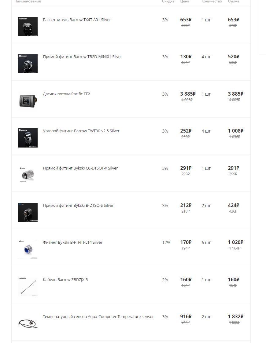 Что сделано и что хочется : 1) куплен список еще пару месяцев назад всяких приблуд на evopc (фото "список закупленного" ). Зачем покупал заранее? да не помню уже. по дурости видимо. Изначально планировалось просто усовершенствовать контур, добавив водоблок на озу и ссд, фильтр, а также потокомер и парочкой термометров и заменив жидкость. ЭТО СЕЙЧАС , почитав, я полагаю , что потокомер B-TFC-CS-X просто для красоты а то и того хуже(поток будет резать) и что жидкости мне не хватит литра готовой и сама жидкостть возможно Г... 2)Но я пошёл дальше. С алика едут Вот такой и Вот такой радиаторы. Но и здесь я тупанул , ибо это первая версия данных радиков , а полностью медные V2 я упустил из виду. Но да ладно. 3)Куплена новая помпа DDC Вот такая SPB17-V2 . Ну я уже опять таки вижу , что нужно было прочесть 1000+ страниц здешнего форума , чтобы понять , что нужно было D5 от аквы брать. Ну посижу и на этой. Покупал исходя из Подобных статей , гласящих о том , что ddc лучше по "продавке" контура. а поскольку я хотел юзать много фитингов угловых и водоблок на гпу в будущем. решил брать ddc . ну ошибся , чё. Кстати есть вопрос , могу ли я использовать две помпы DDC и как лучше? последовательно ? не будет ли проблем с разностью скоростей потока? не скажется ли это на перегреве или сбое "мозгов" данных помп. 4)Поскольку трубки у меня PETG ( и уже закуплены еще 6 штук таких же вместе с компрессионными фитингами) я решил не менять это на описанные в соседних статьях пвх , pu какие-то...или шланги или акрил. та в опу это все. Единственное , что меня в PETG волновало после прочтение здешних опытных ребят , это риск протечки из-за температурной деформации со временем. Но решил проблему вчерашней покупкой Таких вот вкладышей под PETG от ek. Если есть еще замечания по этим трубкам ( ну там , пластик с них слезает или еще чего-то) то напишите плиз. 5)куплен водоблоки для ОЗУи для ВК 6) собрана новая корзина на evopc ( третий скрин). Меня в ней волнуют отсутствие жидкости, ибо её на евопк нету. а также вопрос об потокомере pacific TF2. Стоит ли оставить от букски или пока он закрыт , на авито его продать. потратиться я готов , а вот ждать 2-3 месяца поставку потокомера next от аквакомпьютер - не готов абсолютно. также как и ждать жидкость по типу double protect от аквы.