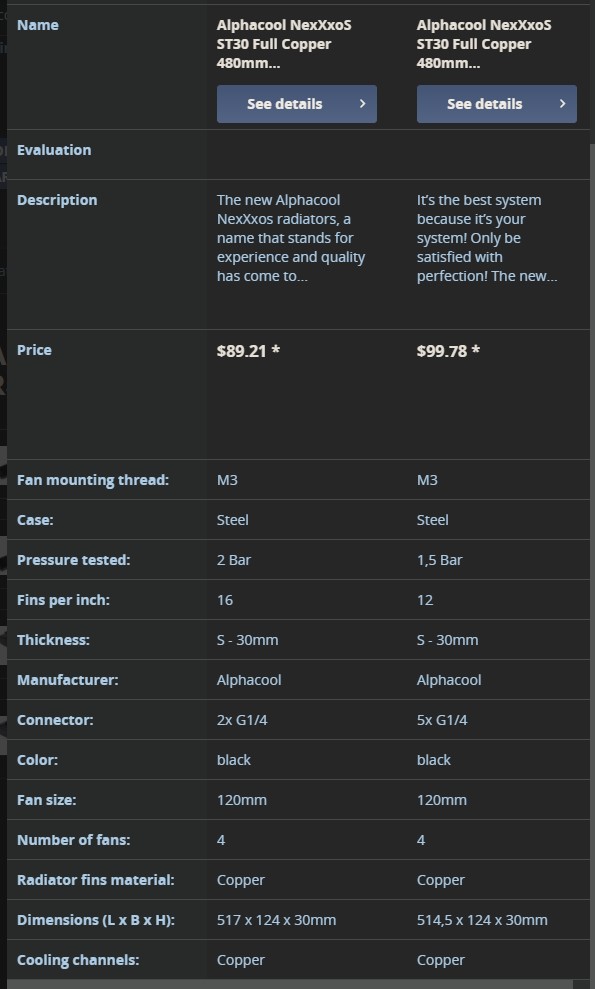 Доброй ночи, Господа хорошие. Владеет ли кто информацией (лучше личным практическим опытом) о разнице между Alphacool NexXxoS ST30 Full Copper 480mm RadiatorAlphacool и Alphacool NexXxoS ST30 Full Copper 480mm Radiator V.2 (разницу в количестве портов опустим - не принципиально для меня). Есть ли смысл переплачивать за новую версию?!