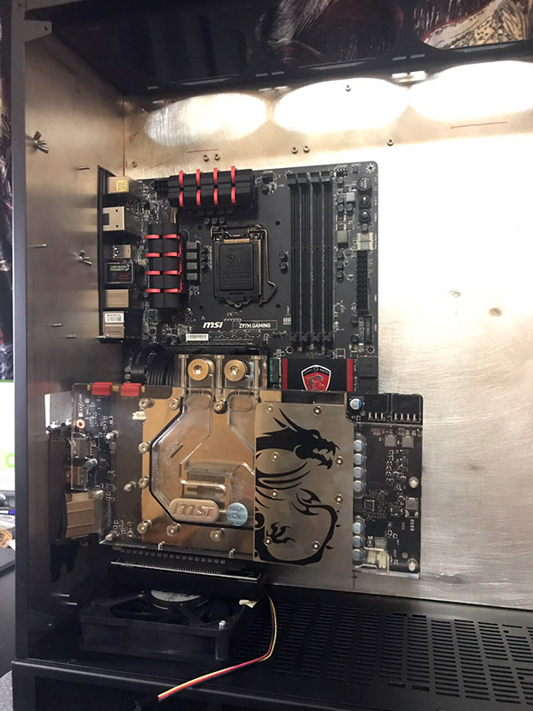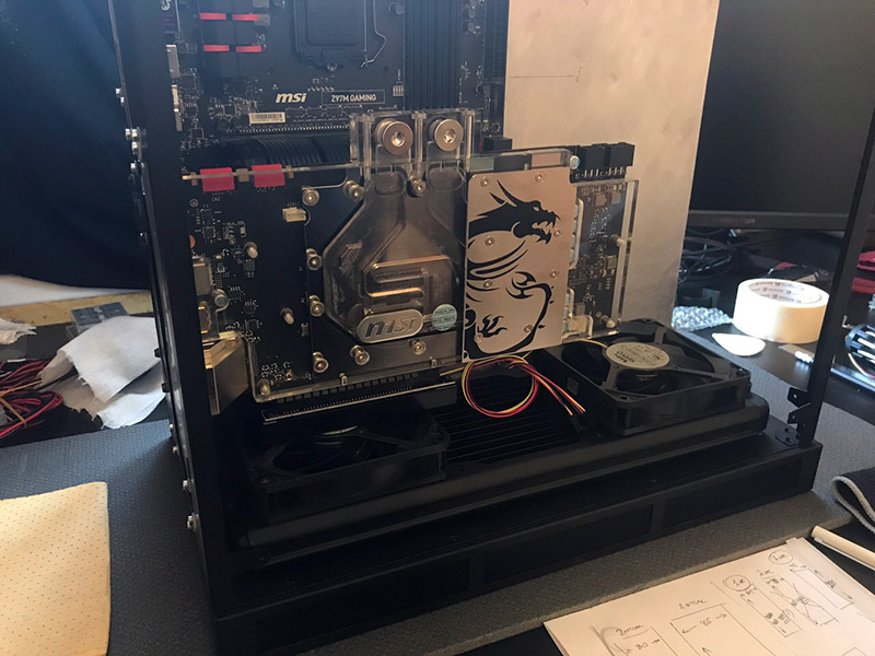Обдув на воздухе был косвенный с топовой ноктуа башни, на воде же толком нет, воздуха гуляющего по корпусу недостаточно. Сейчас как-то так, даже специально все на выдув сделал, чтобы тепло не накапливалось внутри, корпус плохо "дышит"