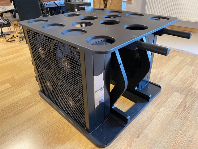 Да, не малютка. Если делать короче (строго под размер моры), то стойки перекрывают засос воздуха. Поэтому, там чуть больше. Вся тяжесть на нижней плате. Ручки для переноса вкручиваются в стойки, которые (я про стойки уже) к низу закреплены штифтами и винтами - там намертво. Поэтому, поднимаю всю конструкцию за стойки. Сверху отверстия для облегчения конструкции. Верхняя плата, хоть и закреплена к стойкам, используется только, как подставка (сверху всё равно большой вес выдержит). Зато всё в одном месте собрано. Стены сверлить не надо, шланги по полу не валяются.
