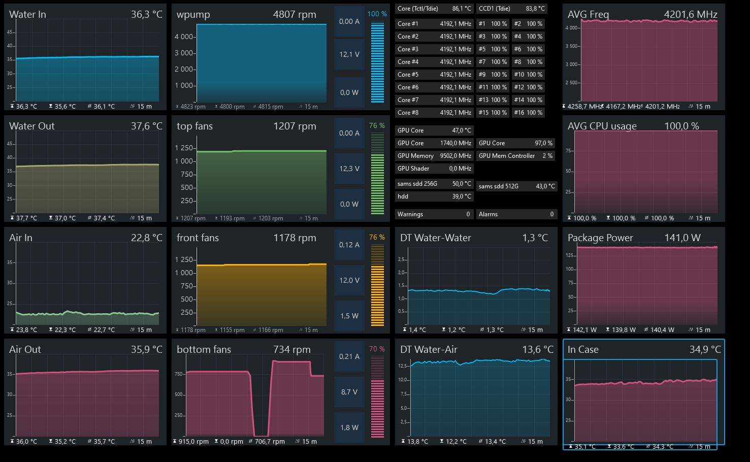 CrownA Да в общем то все что есть у тебя, есть и у меня на дашборде. Да, нет MPs 400, но его вообще трудно найти сейчас. В evopc не и непонятно когда будет, на aquacomputer.de, outofstock. А у нас если есть, то стоит под 8к. Это уже слишком. А чем ты мощность измеряешь? Общую я могу измерить через ups. Но на дашборде не отобразить.