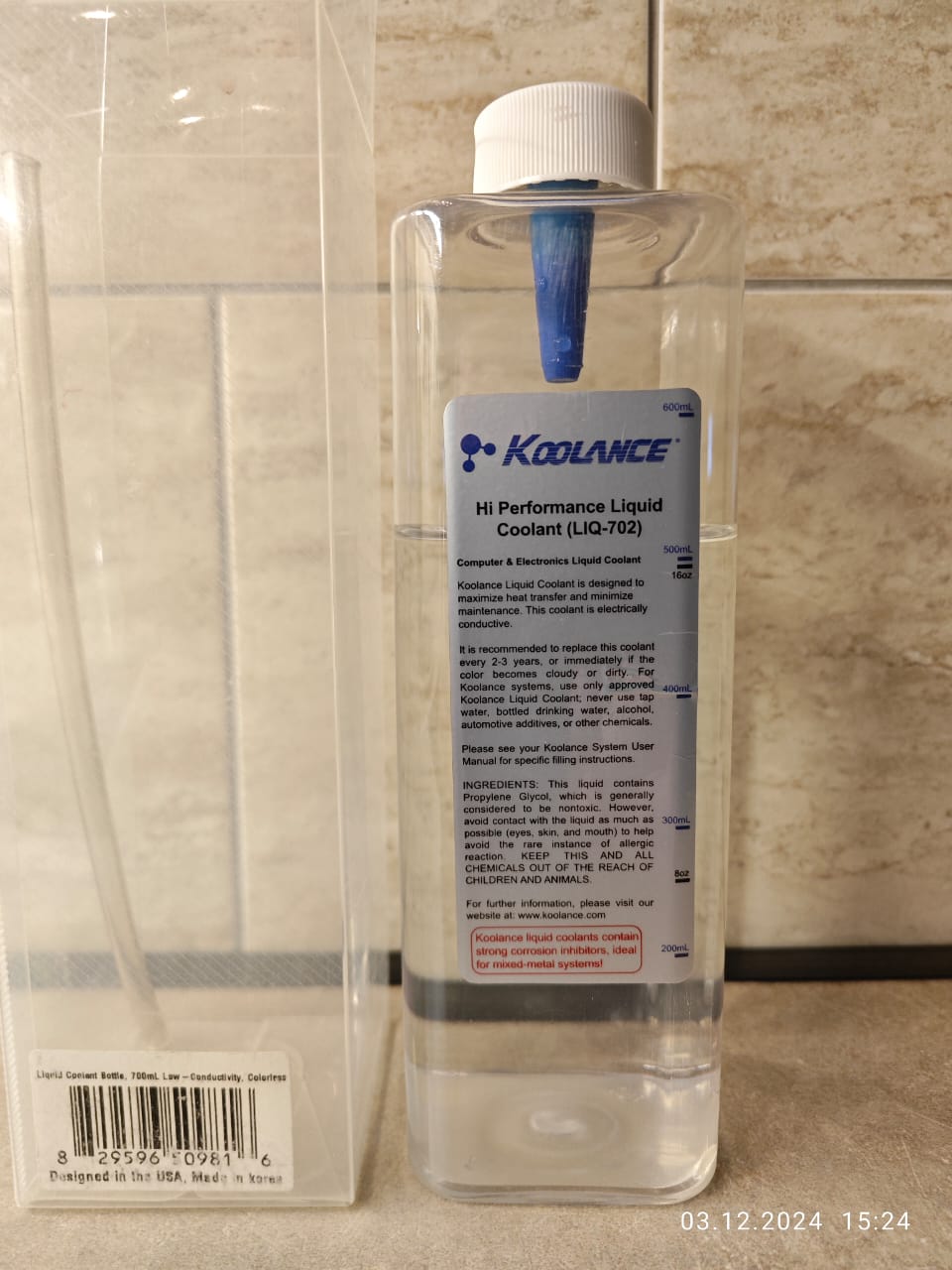 Ну и где в спецификациях пендосов ваши слова..:-"чистый пропиленгликоль как в 702 кулансе где присадок менее 1%"..!!!!!!!!!!!!!!!!!!!!? Вы, думается водицу забыли, коей большинство в растворе Koolance... )) Смотрите... Взял флакон Koolance LIQ-702 и сфотографировал --- красненьким прочитайте чего написано...