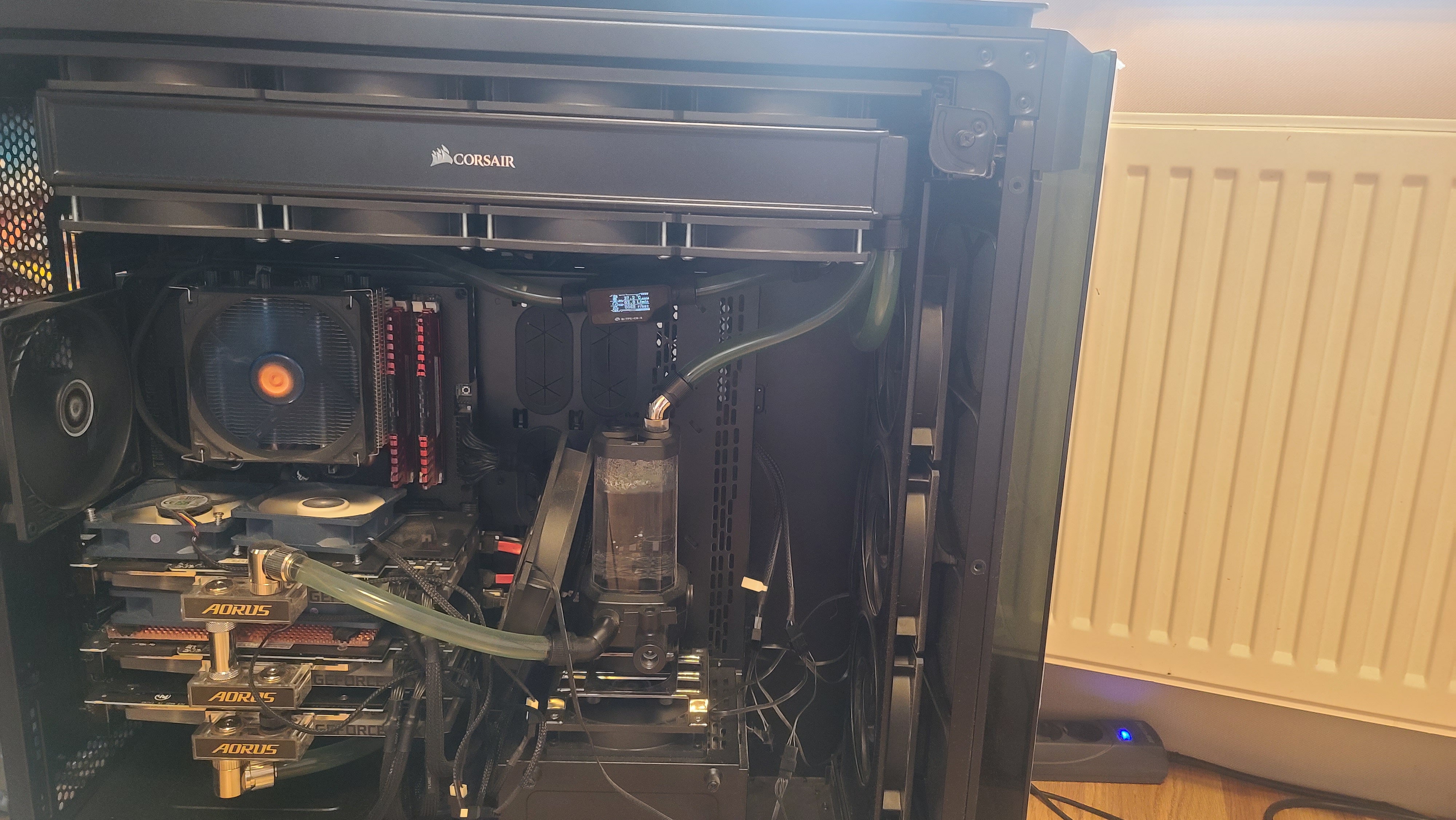 Думаю всё выжал на данном этапе. Почти 900вт карты. На открытый блок дует кондиционер 18°.температура воды 37. Вот хочу на бэки карт вб поставить и закрыть корпус.Планирую на процессор ещё вб поставить. Пока там воздушка. Так же в планах matx туда воткнуть и процессор с картой тоже под водой в этом контуре. Но с установкой моры планирую добавить вб на процессор и пару вб на бэк карт.