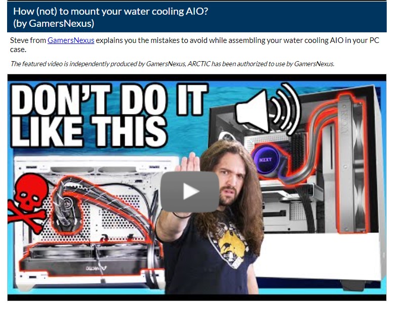 С таким перепадом может и прокачает, а вот когда установлен 360 радиатор и мат.плата установлена без такого зазора сверху, то мощности AIO помпы в жизни не хватит. И это не теория, о которой ты постоянно бредишь не обладая даже минимальными знаниями в физике или технике, даже банально не будучи способным на критическое мышление и свято веря всему, что покажут на ютубчике. Это я проверил на практике, когда помпа без перерыва стрекотала в таком положении. Стоило переставить шлангами вверх - как стрекот воздуха пропал. Вот тебе тоже картинка с support.arctic.de