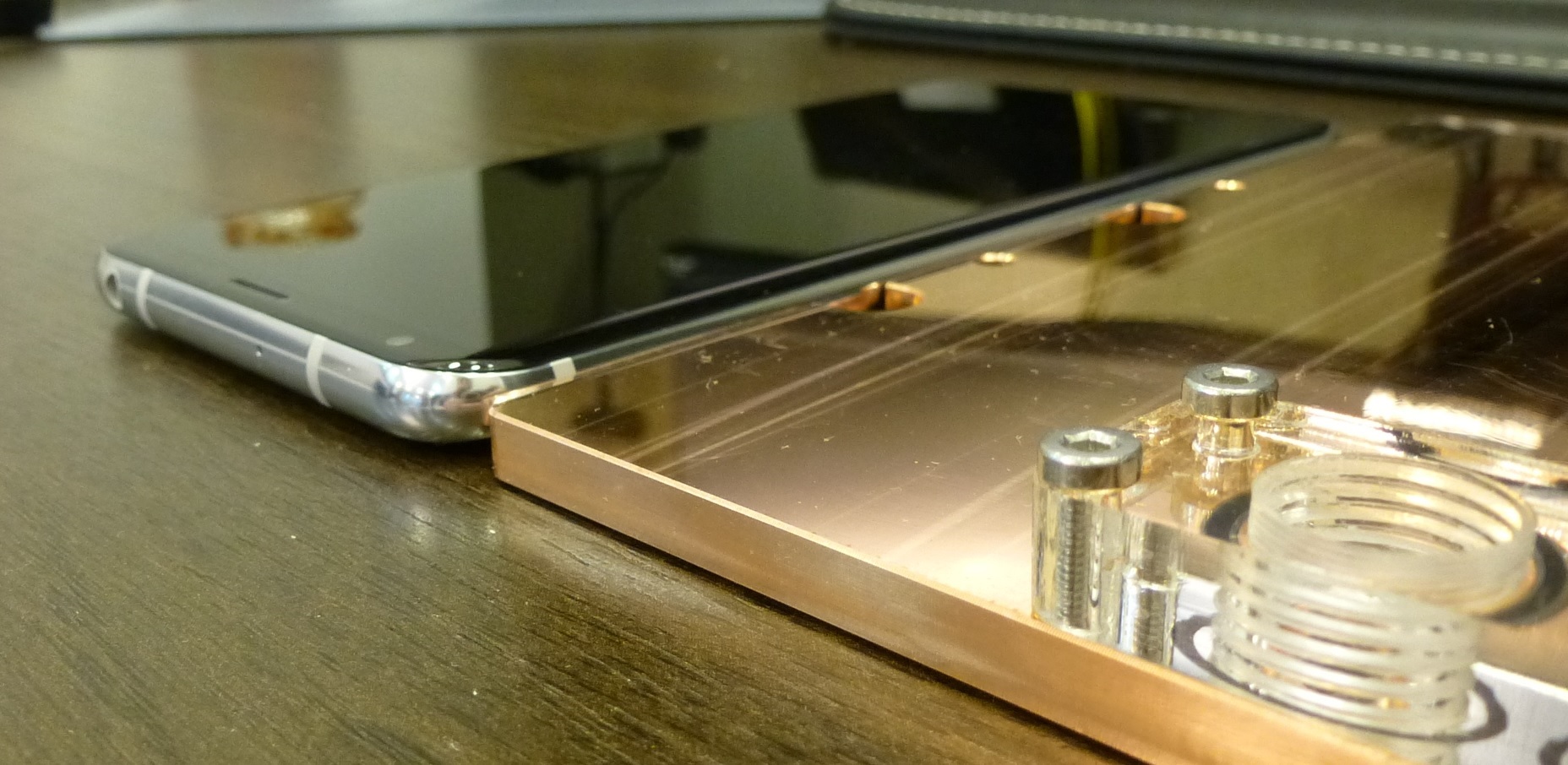 Габариты - 5.55мм, вес 655грамм, т.е. взяли толстый кусок меди (5.55мм) и вырезали из него водоблок. В весе есть и тонкая стальная пластина с другой стороны, но основной вес - это безусловно медь.