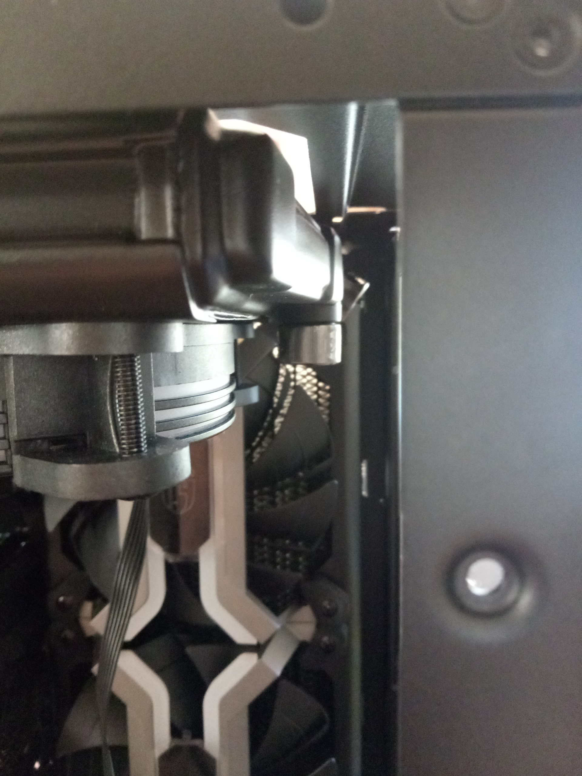 Может есть возможность перевернуть радиатор (который вертикально стоит) на 180°... вход/выход-отверстиями вниз... и проблемы тогда отпадут? У меня в PC-O11 как-то расстояния поболее вверху...
