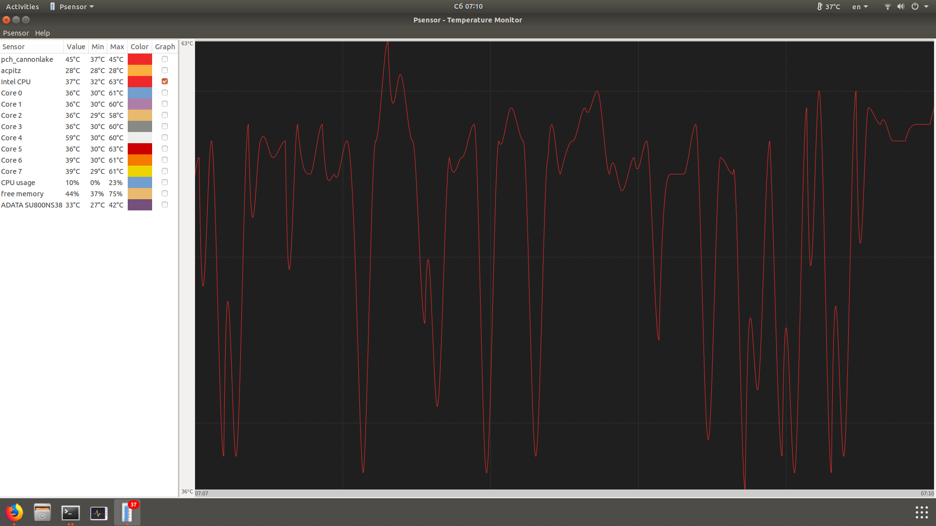 Загрузка процессора меняется волнами, скриншот температуры процессора за 2 минуты приложен. Каждые пару секунд температура меняется от 35-40 до 60-65 градусов.