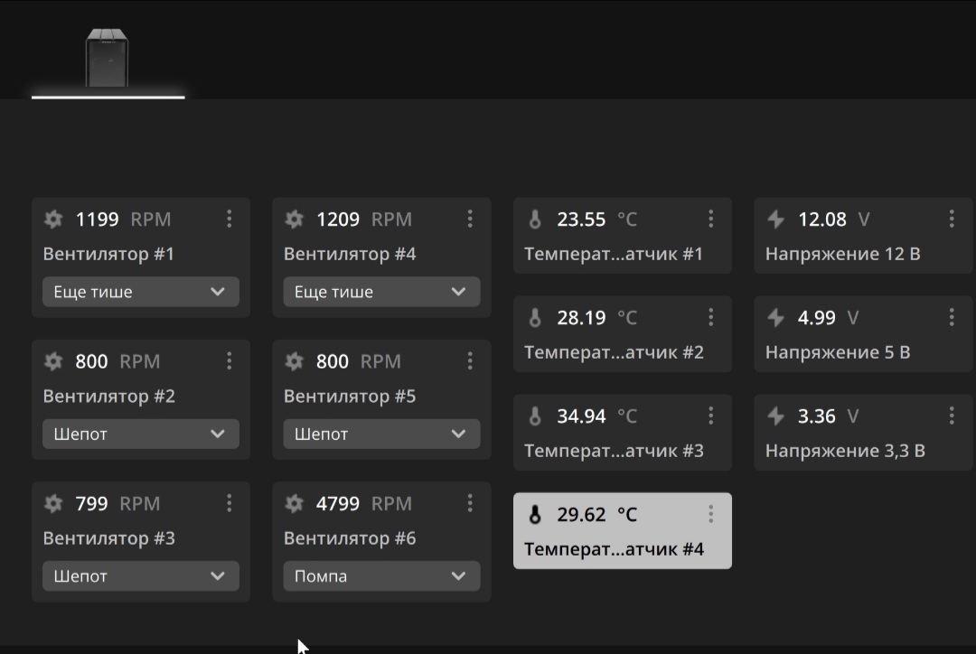 Вентилятор 1- вдув в корпус 8х120 Вентилятор 2 и 3- push/pull на 2х480 в корпусе сверху на выдув 16х120 Вентилятор 4- мора420 9х140 Вентилятор 5- отсек для hdd 1x120 (вообще лишний) Вентилятор 6- догадаться не сложно Темп датчик 1- снаружи корпуса перед входом Темп датчик 2- в районе основной мат платы Темп датчик 3- в районе второй мат платы слева внизу (самое далёкое и мало продуваемое место) Темп датчик 4- вода на входе в корпус после моры Дельта вода воздух пойдёт я думаю)