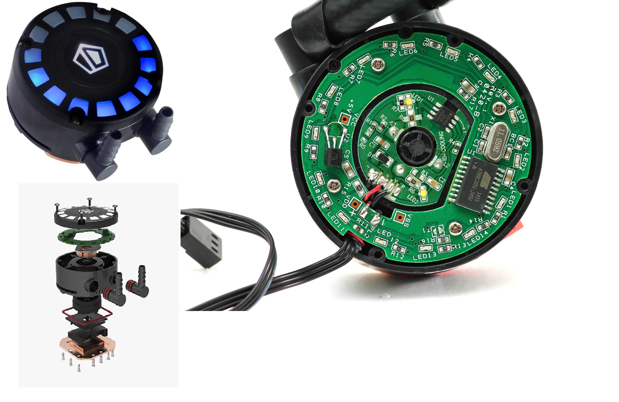 Странно...судя по описанию с сайта производителя на питание помпы должен идти 3пин коннектор а не sata С трёх пиновым можно было бы мониторить помпу. Хотя судя по плате помпы два контакта не припаяны...один из них идёт на датчик оборотов вентилятора(датчик холла) Можно попробовать заменить на трёхжильный
