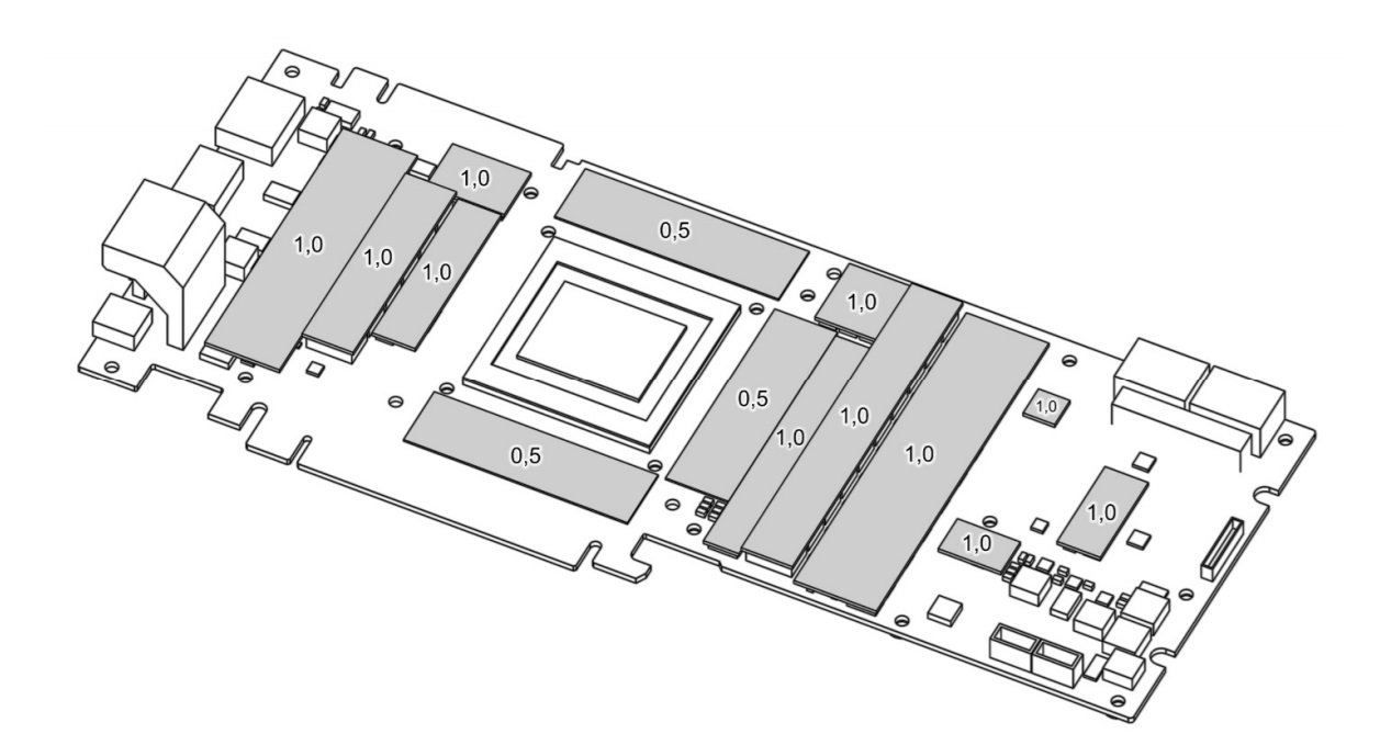 Толщина термопрокладок указана в мануале к водоблоку, если речь идет о фуллкавере. Универсального варианта нет, каждый производитель проектирует водоблоки по своему, с разным зазором между теплосъемными площадками на водоблоке и элементами платы карты.