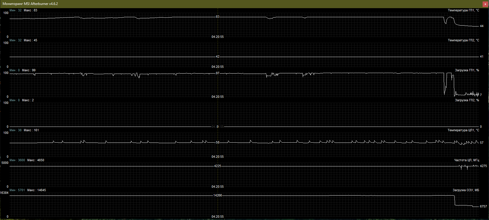 Я бы предположил что водичка градусов 50 в контуре в итоге в данной нагрузке(всего скорее где-то за минут 30-40 прогревается до максимальной температуры). Видяхи думаю греются под такой нагрузкой с дефолтным напряжением градусов на 10-13 при хорошей скорости потока(EK FullCover не лучшая модель по эффективности). Но вряд ли поток на видяхах хороший т.к. помпа одна, в контуре неплохое сопротивление и параллельное подключение(которое должно резать поток на каждой гпу ~в 1.5-2 раза в данной ситуации). Так что вижу явную проблему только в температурах второй видяхи. -Всего скорее из-за параллельного подключения поток делится слишком не равномерно и одна из видях страдает от очень слабой прокачки. Я бы соединил последовательно. -Ну и никто не отменял плохую установку фуллкавера. К примеру на своем опыте - выиграл 5-7 градусов перерустановив фуллкавер повторно с минимумом термопасты.