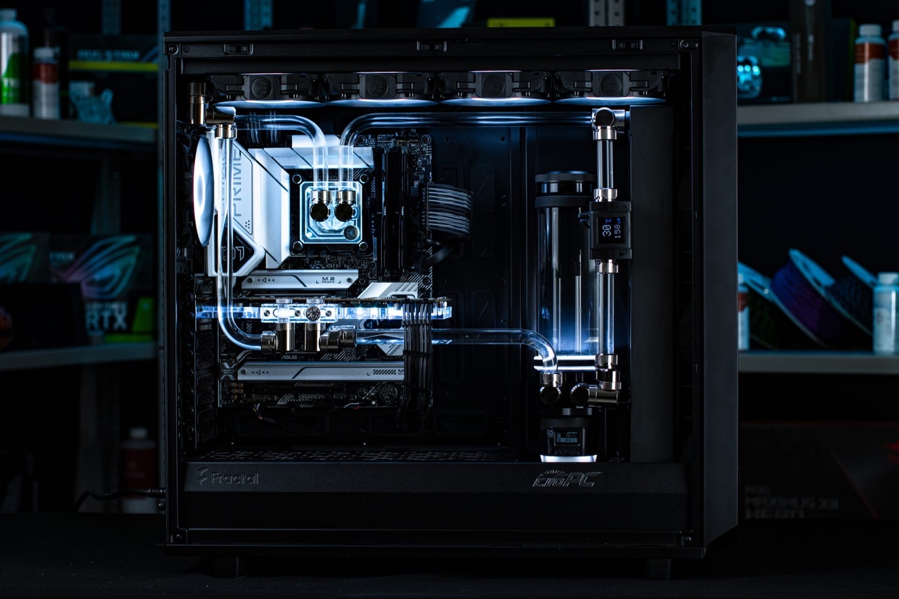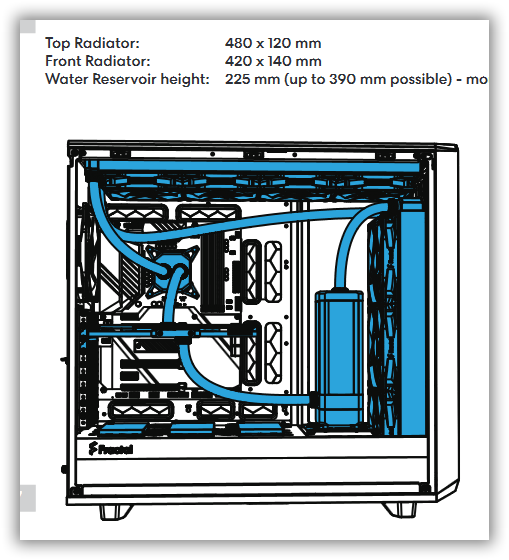 Georg7490 у вас наибанальнейшая конфигурация и максимально примитивная цель для сборки контура, но вы пытаетесь все это преподнести как какой то космический корабль. Что имеем из сухого остатка: компьютер для рендера(условно), который будет работать 24/7. Вся работа будет идти на процессоре. ВСЁ Все разговоры, что видеокарта у вас есть, но может быть когда нибудь вы купите RTX 30 или 40 серии, говорят о том, что вам карта не нужна. А что будет потом никто не знает. Даже вы. Нужна была бы карта, она бы уже лежала среди другой кучи дорого железа которое вы имеете. ССД, ОЗУ, М2 - этим компонентам СВО не надо, ни при каких условиях, чтобы вы не писали и говорили. Все что вы можете сделать для этого поставить вентиляторы на ТОП чтобы они отводили тепло. Для охлаждения процессора вам нужен радиатор на 420x45 на фронт, 3 вентилятора, помпа с резом, например ek tbe 200 d5(именно 200, тк с ней удобнее будет работать нежели с 300), ватер ek(под 1700 есть переходники в доступе). шланги 10/16, ибо они гнутся сложнее нежели 10/13 какие нибудь. Вентиляторы арктик замените на что-то производительное. Например TT ToughFan 14. До 120 CFM выдают https://ru.thermaltake.com/toughfan-14- ... -pack.html Передние корпусные вентиляторы Фрактал переносите на ТОП, для отвода тепла питальника МБ и ОЗУ Если уж хочется что-то мониторить и контролировать - берите Aqua Computer Flow sensor high flow NEXT, G1/4 - у Сергея Мнева есть подробный обзор на эту штуку. Обязательно тройник и кран для слива. Сейчас появились в продаже удобные адаптеры https://www.evopc.ru/catalog/fitingi/ra ... eli/35943/ Если параноя не отпускает, то сразу берите 480х25 на верхнюю панель. Радиаторов в наличии в магазах(evopc , zhelezanet) с запасом - ek, TT, alphacool, corsair(они же bitspower, HWLab) Ликшилд не нужен, какие то еще доп. контроллеры не нужны. Если вам грамотно соберут контур - это будет работать годами без каких либо проблем(если не грамотно то вас и контроллеры не спасут). Не забывайте что это еще нужно обслуживать. И если вы добавите туда все компоненты на СВО которые хотите, то потом это обслуживать будет сущий ад