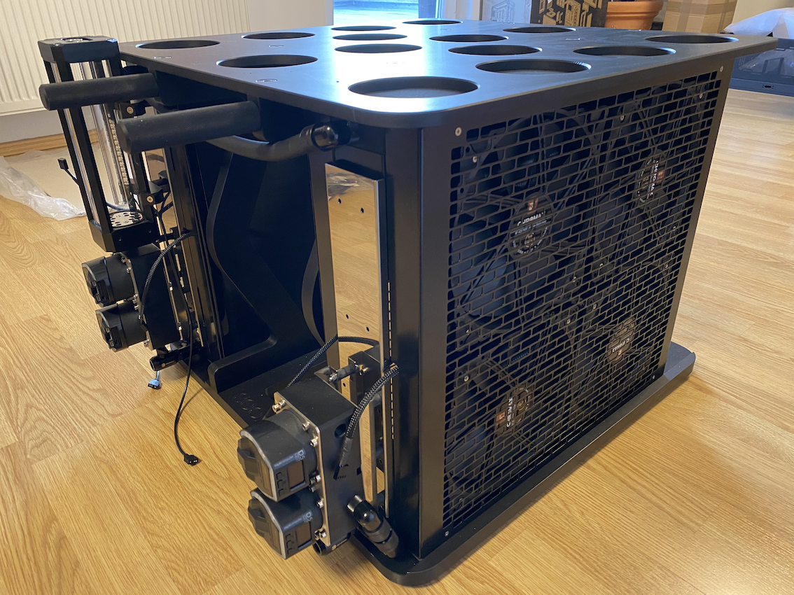 losinka сделано из мебельной МДФ похоже... 2 ВОПРОСА, нафига ставить помпы некст если это подставка и их никто не увидит? ну и как это перемещать? там веса 30+ кило и ещё сверху системник будет за ручки такое тягать - будет не очень ИХМО напрашиваются колёса под инструментальные тележки ( так и катать будет удобно и пыль/ волосы с пола собирать будет намного меньше ну и до кучи надо сверху предусмотреть крепёж под системник, а так поделка интересная и вероятно весьма эффективная, хотя в таком размере я бы собирал на циркуляционном насосе ну и в текущем стеапе будет качать нормально, единственно я бы помпы и рез перенёс во внутреннее пространство или расширил раму так чтобы они не выступали за пределы рамы, в таком виде запросто можно смахнуть или что-то сверху уронить с печальными последствиями.