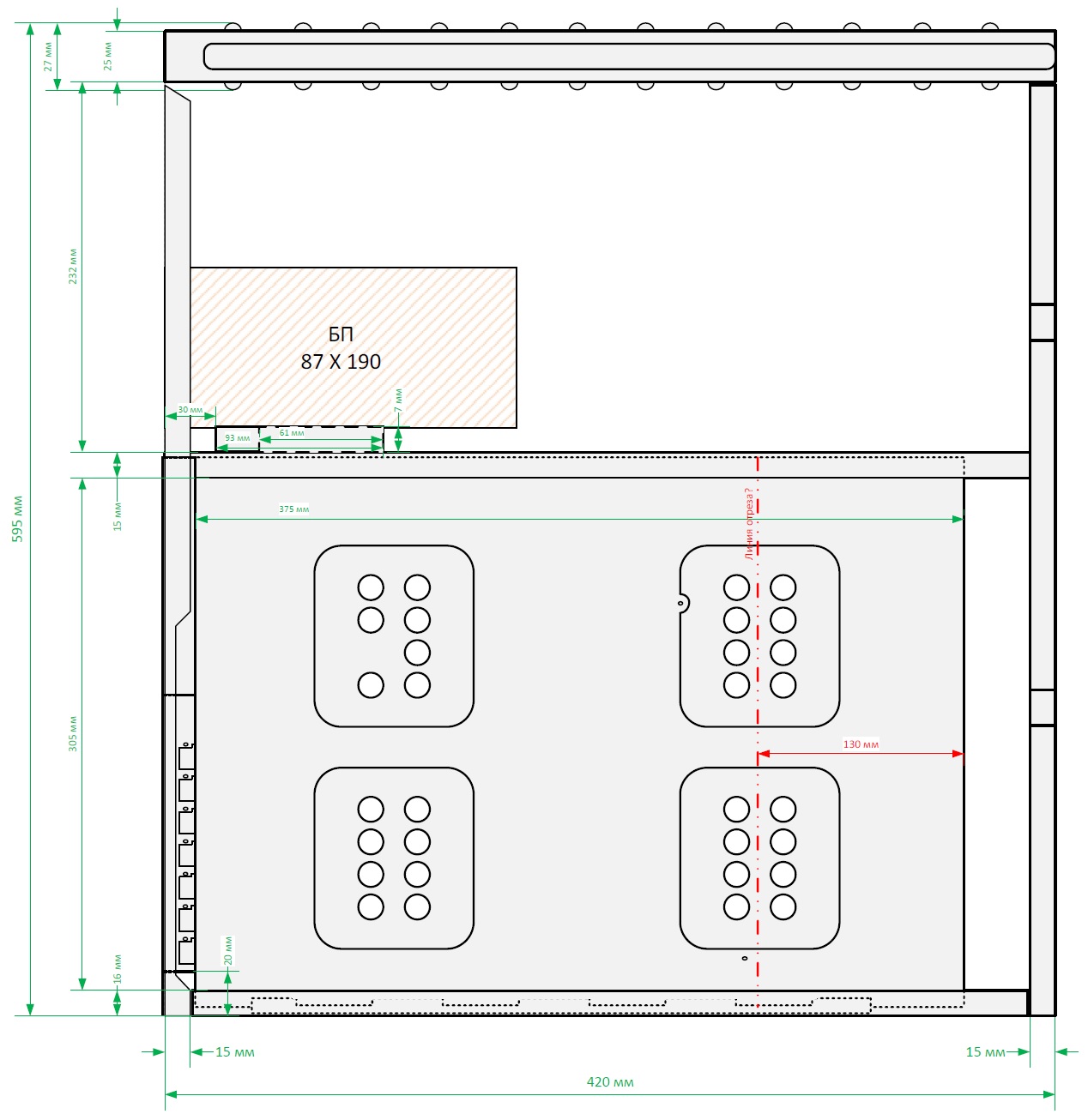 1. Пластик фронта: • Кнопу питания переместить + ресет (https://aliexpress.ru/item/1005001604210551.html) • Добавить ЮСБ разъем по флешку • Закрепить дверцу, чтобы не отваливалась на шпильки (можно через на замок закрывать). • Приклеить сетку от пыли снизу. 2. Сзади снизу расширить дырку под вентилятор 120мм, включая корзину МП. 3. Корзину МП укоротить (согласно чертежу) 4. Предусмотреть крепление вентилятора спереди сверху (в дверцу - на пластик 2 по 120 или 1 на 140мм)) 5. Снять ниж и верх корзины (верх можно укоротить и оставить место под 1 SQD и SSD 3.5 если будет один на 1 х 140) 6. Сзади сверху расширить дырку с 80мм до 120мм? Имеет ли это смысл? по-моему достаточно хорошо продувается спереди и сверху. 7. Убрать петли на верх крышке спереди, чтобы была ровная поверхность. Сделать дырки под крепления 3 х 140 (120) по центру. 8. Сверху на шасси необходимо предусмотреть посадочные скобы под крепления радиатора. Чтобы можно было положить его сверху на них (Выбрать толщину радиатора). 9. Сверху по бокам нужно на высоте от верх планки 13см сделать крепления (полку) под радиаторы с обоих сторон. 10. Выпилить спереди снизу под вентиляторы 2 х 140мм (120?) 11. На правой дверцы снижу сделать дырки под 2 х 140мм (120?) и съёмный кронштейн (уголок) крепления радиатора внутри на фронтальной стороне. 12. Сделать отверстие спереди или сзади для заливки воды в радиатор через его отверстие. 13. Сварить все слабые места. 14. Предусмотреть дырки под трубки в корпусе 15. Покрасить корпус порошком целиком + отдельно пластиковую морду.