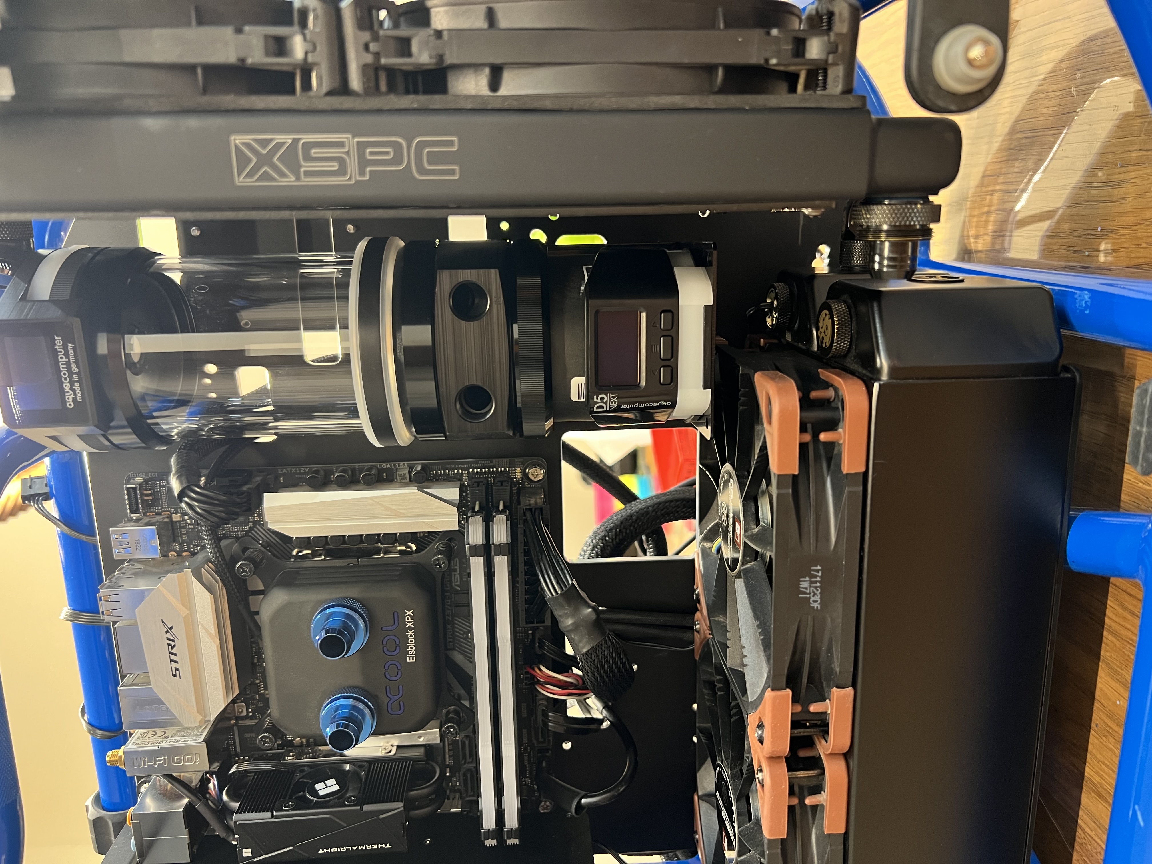 Решил поменять помпу с резиком и в связи с этим заодно решил перебрать водянку, раньше трасса шла так - Топ->гпу->ut60->cpu->xsps->топ. Но тогда по другому немного располагались радики и помпа с резиком, находилось более компактно, сейчас пересверлил отверстия в стенке и перевесил все по другому, развернул радиатор, раньше xsps кулеры выдували из него воздух наружу, сейчас развернул внутрь, ну кароче вот как есть сейчас. Имеет смысл опять морочиться с трассой пуская теплоноситель в радиатор между цпу и гпу или можно последовательно пустить, так получится красивее трасса поидее. То есть пустить топ->цпу->гпу->ut60->xsps->топ? Железо кор i7-9700k и 5080 с альфакуловским радиком.