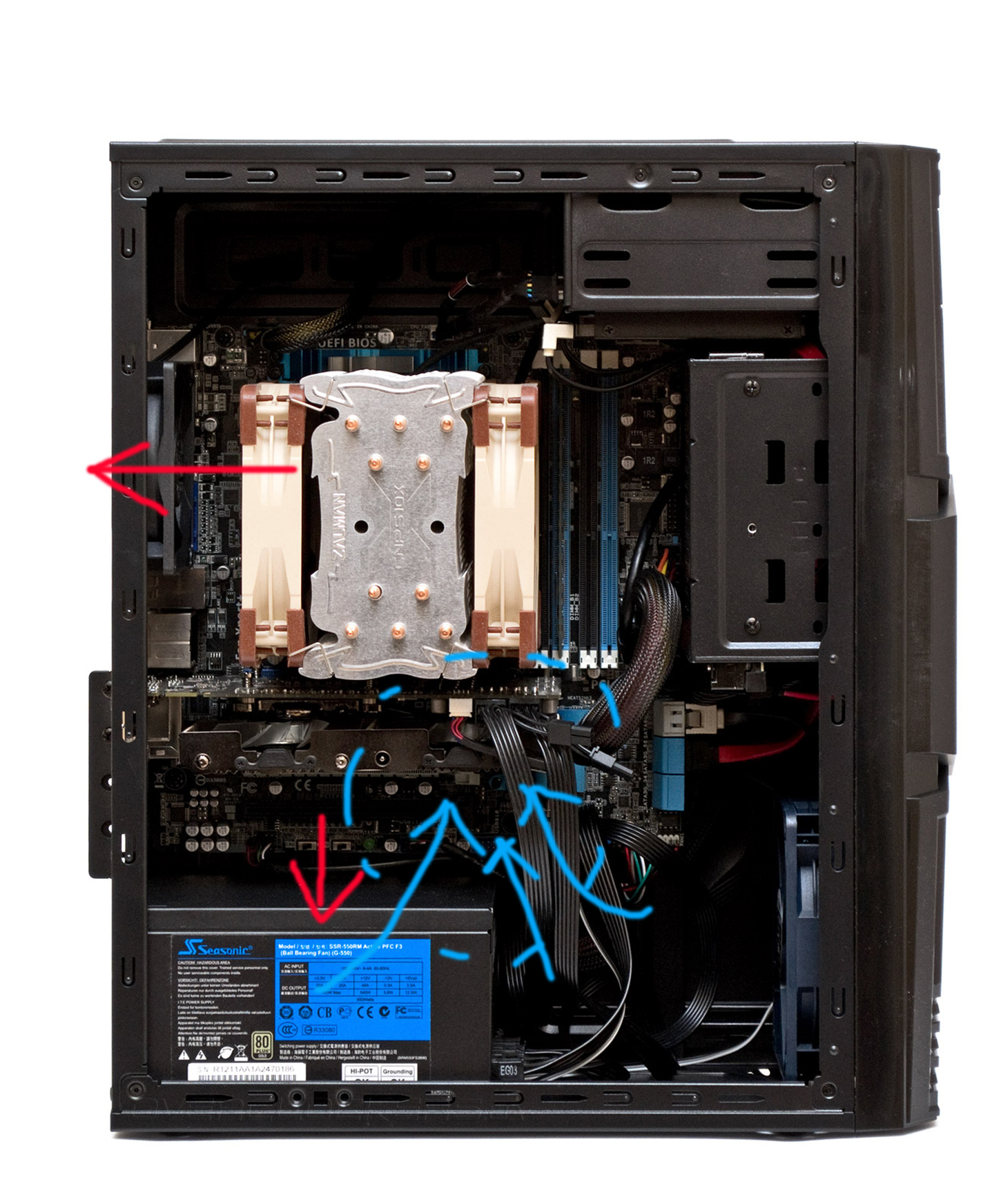 ни когда не делайте так,только вентилятором вниз,бп тоже охлаждаться надо, а вы его теплым воздухом продуваете. вот самый оптимальный и правильный воздушный поток