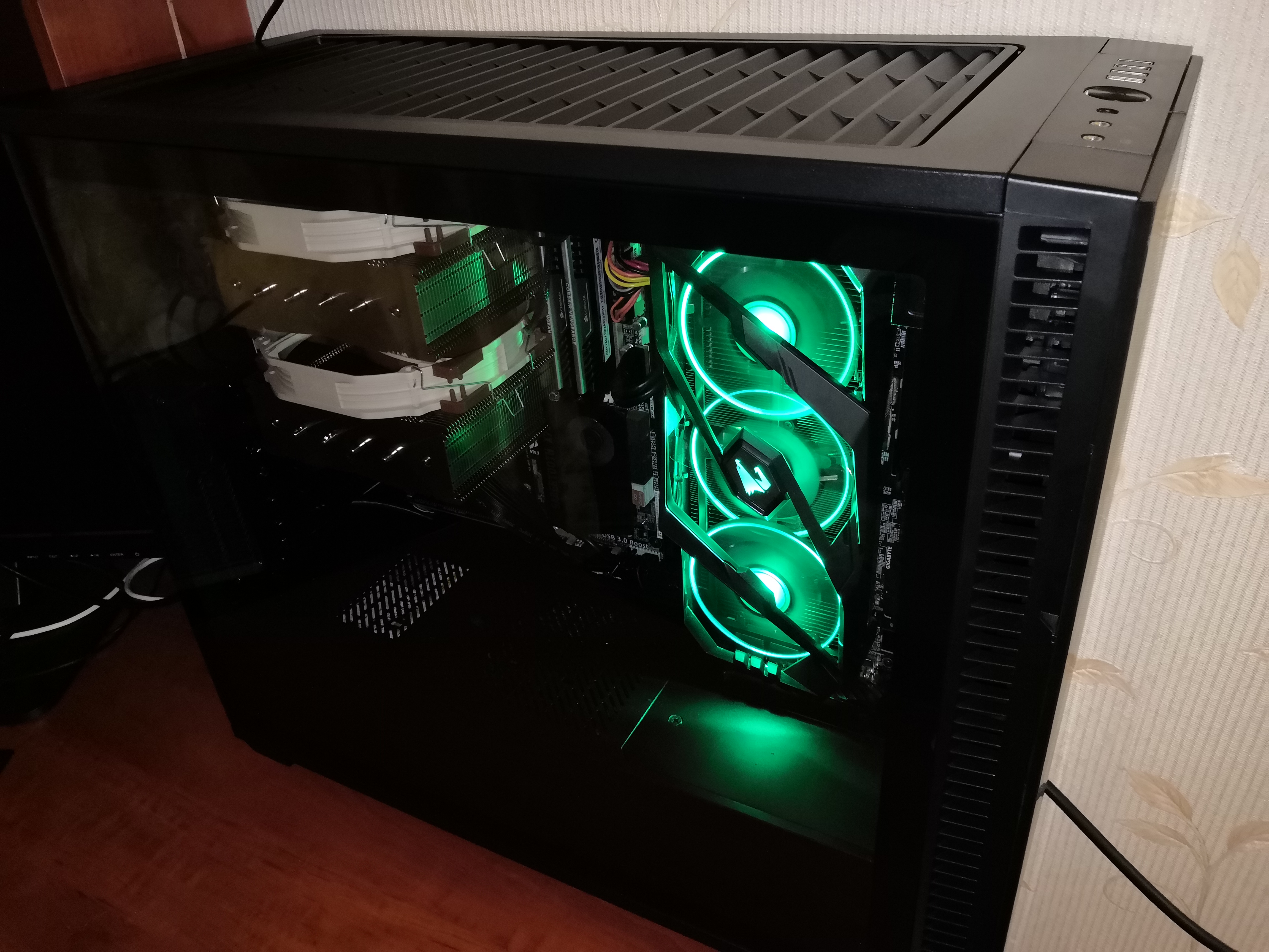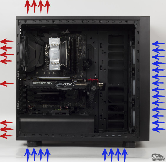 Сейчас в корпусе на вдув: перед 140ммх2 (поток направлен на видеокарту) низ 140ммх2 ( поток направлен на материнскую плату)