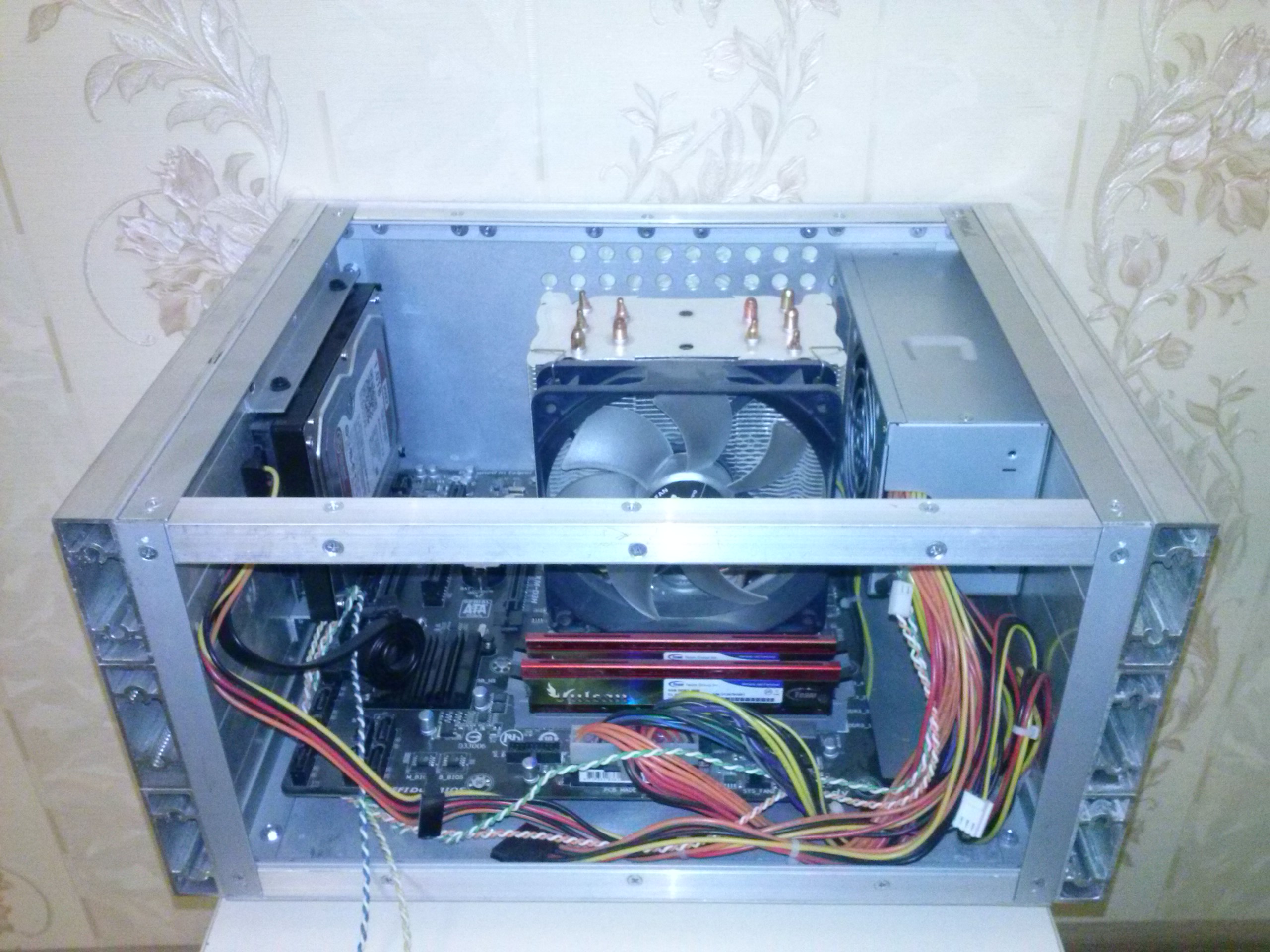 Железки жили в картонной коробке, потому как доступные покупные корпуса мне не понравились размерами. Все бы хорошо и прекрасно, но мне постоянно не везет с вентиляторами на системе охлаждения. В общем родная вертушка Zalman CNPS10X Performa начала трещать практически сразу, непонятно правда чем именно, то ли мотором, то ли подшипником. Звук с виду не сильно громкий, но мне выносит мозг, если в тишине посидеть в комнате где находится HTPC то буквально через час у меня начинает болеть голова. По этой причине комплектная вертушка была заменена на Zalman ZM-F3 FDB и счастье вроде бы наступило, но длилось оно не долго. Спустя примерно месяц эксплуатации эта вертушка тоже начала противно стрекотать, то ли мотором, то ли подшипником. Желания менять опять вертушку у меня не было, по этой причине HTPC работало только тогда когда смотрим фильмы, если с нее просто серфим по интернету - обязательно включаем радио, тем самым забивая звук вентилятора. Так длилось довольно долго, но все таки я решился доделать корпус и почти его закончил: