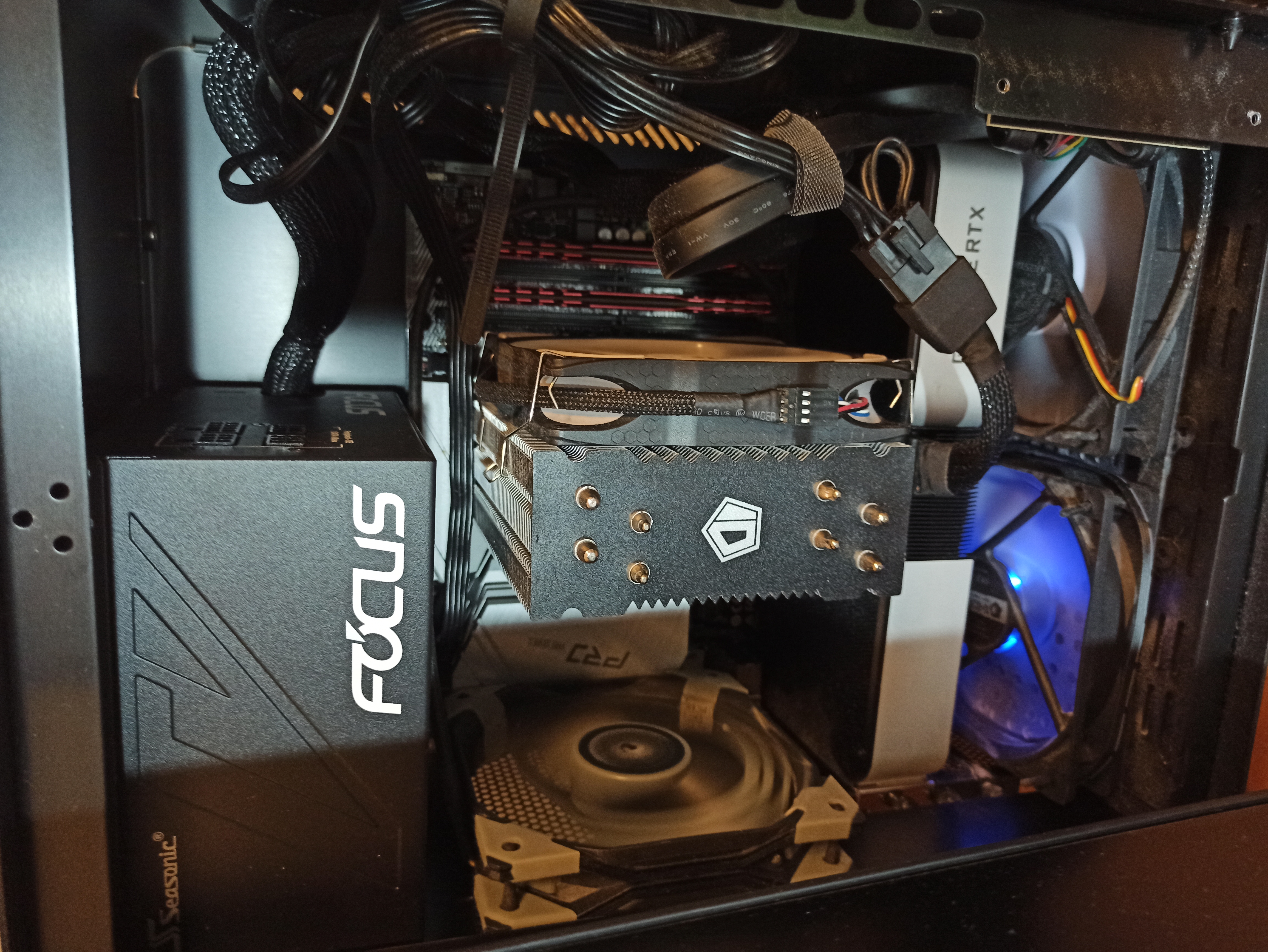 Сейчас стоит сборная солянка из вентилятора Jonsbo (шел в комплекте с корпусом), ID-cooling от кулера (на кулере стоит Noiseblocker NB E-loop, покупал лет 7-8 назад, его не меняю) и на выдув стоит Cooler master (модель не помню, но он уже, мягко говоря, издает посторонние звуки).