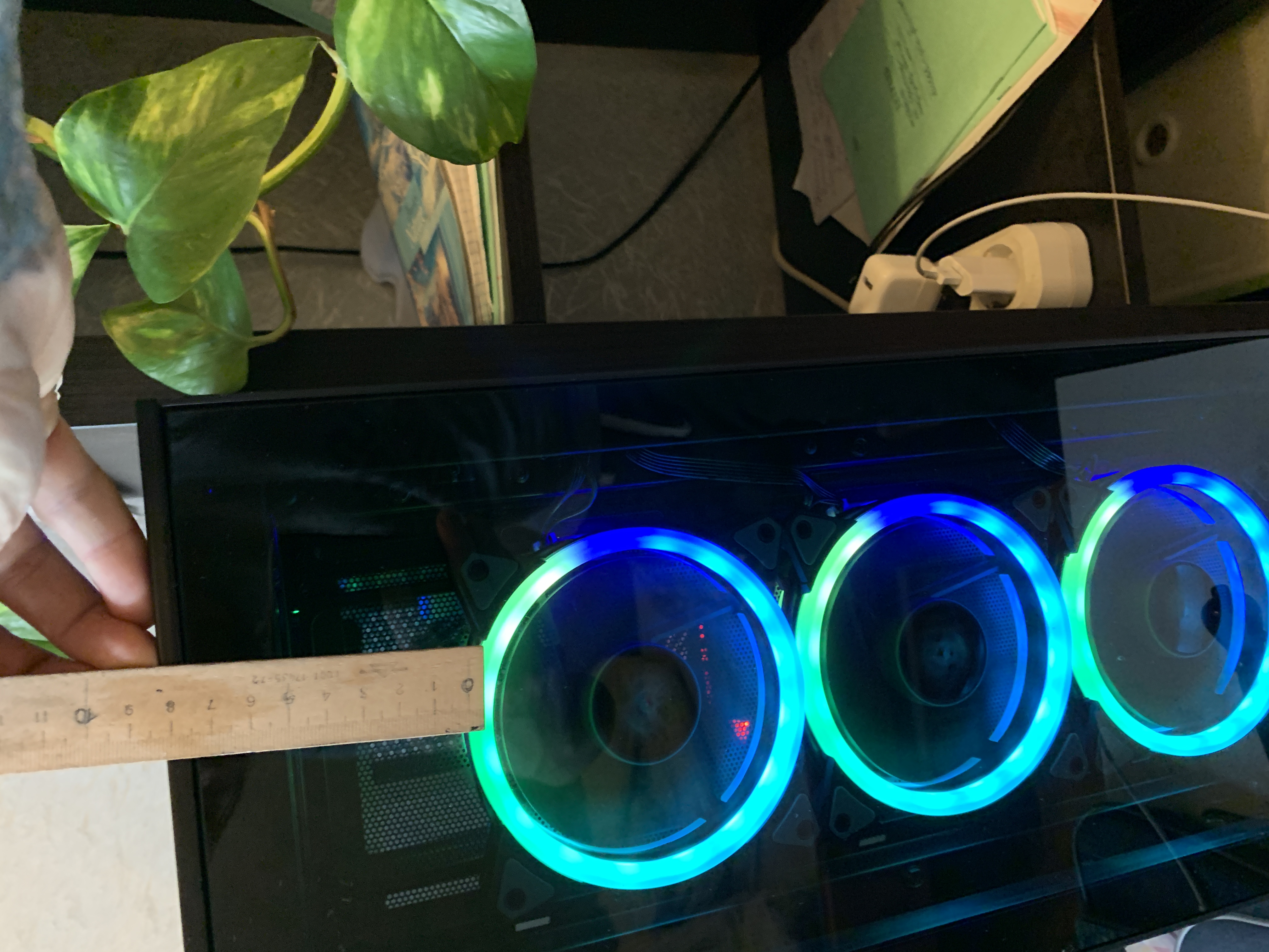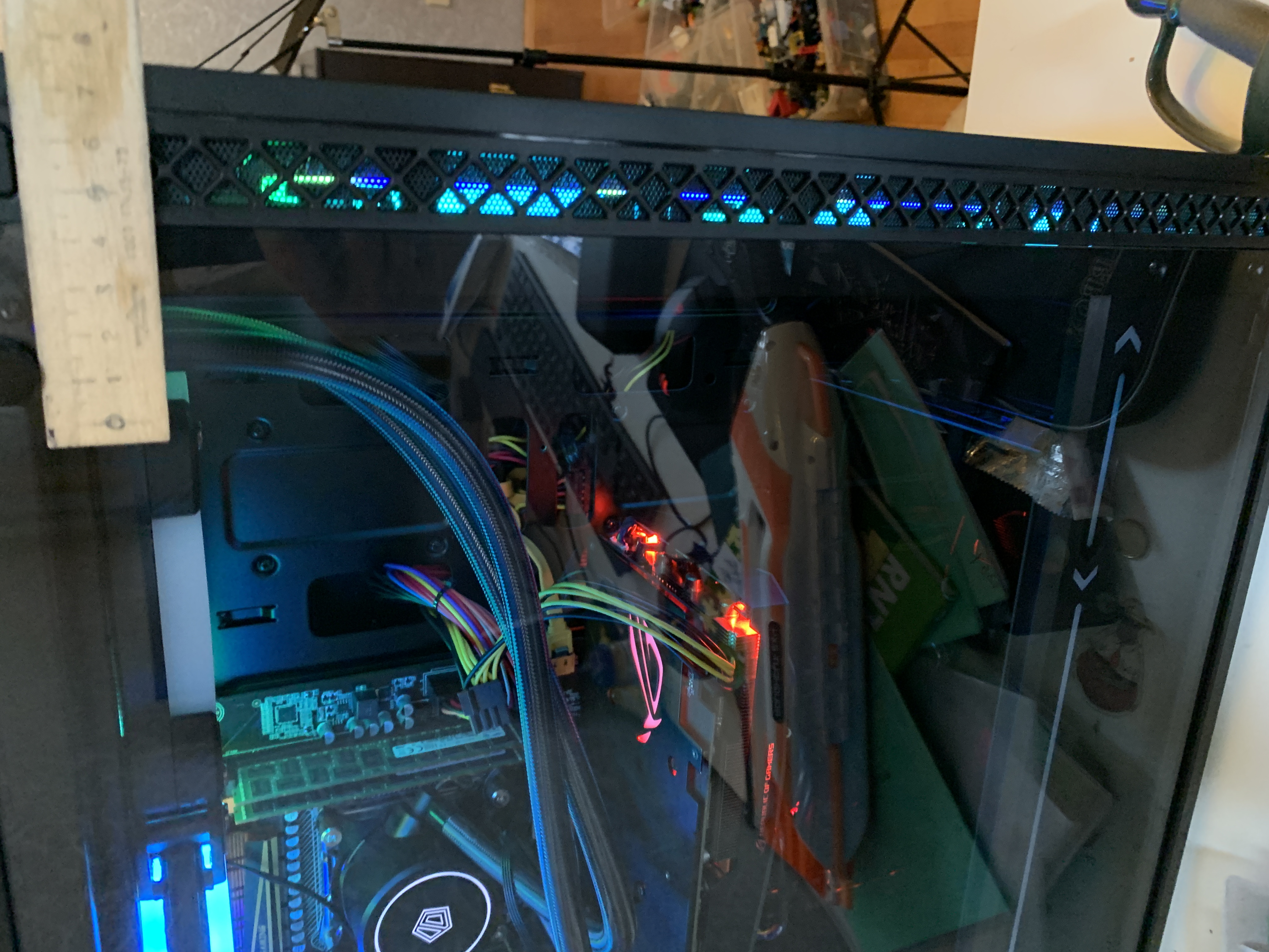 1-2 во фронте - внизу 1-ин в нишу дует под бп, и ровно за ним по середине. Плюс боковой выдув, и вода 360 наверх. Эффективность не хуже что и с третьим- так зачем больше шума и пыли?. Врм остался такой-же по температуре как на воздухе, память чуть прохладнее- так как ей ничего не мешает. В итоге 2 -140ки на вдув на 58 литров корпус, за глаза при такой комплектухе как у меня, при должном выдуве. Но могу и ошибаться- это мой опыт в конкретном корпусе.