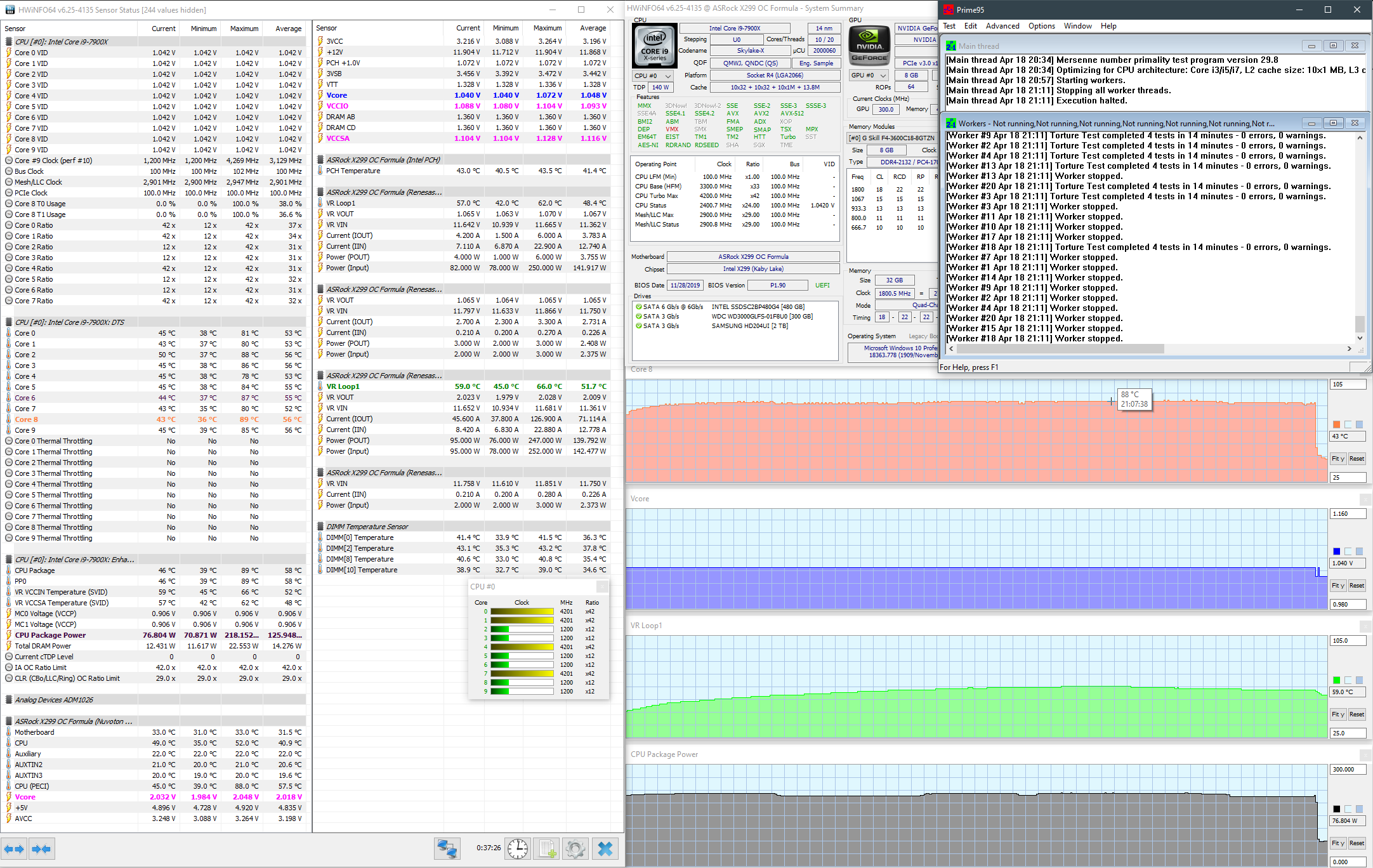 Prime95 29.8 build 6 Small FFTs без AVX. К слову, с AVX температуры не выше, поскольку при разгоне у меня в BIOS установлены -5 для AVX и -8 для AVX2. Так что на частоте 4,2 ГГц без AVX я получаю такие же температуры, как и с AVX, работающими на 3,7 ГГц или с AVX2 на 3,4 ГГц. С другими настройками этот процессор не гонится. Такое же соотношение сохраняется и при разгоне процессора до 4,3/4,4/4,5 ГГц. Потребление с AVX выше, конечно. Но главное, почему я не использую инструкции AVX при прогреве CPU это всё же нелинейность нагрузки.