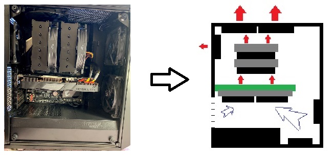 Если комп используется преимущественно как игровой, видеокарта является наиболее дорогой и горячей частью, а у процессора имеется запас по охлаждению, то можно попробовать переделать по нижеприведенной схеме. Особенно хорошо горячий воздух с видеокарты отводит перевернутый на 90 градусов крупный, в особенности двухбашенный кулер, со 140 мм вентиляторами. Перед переделкой, естественно, следует тщательно изучить все размеры и крепления.