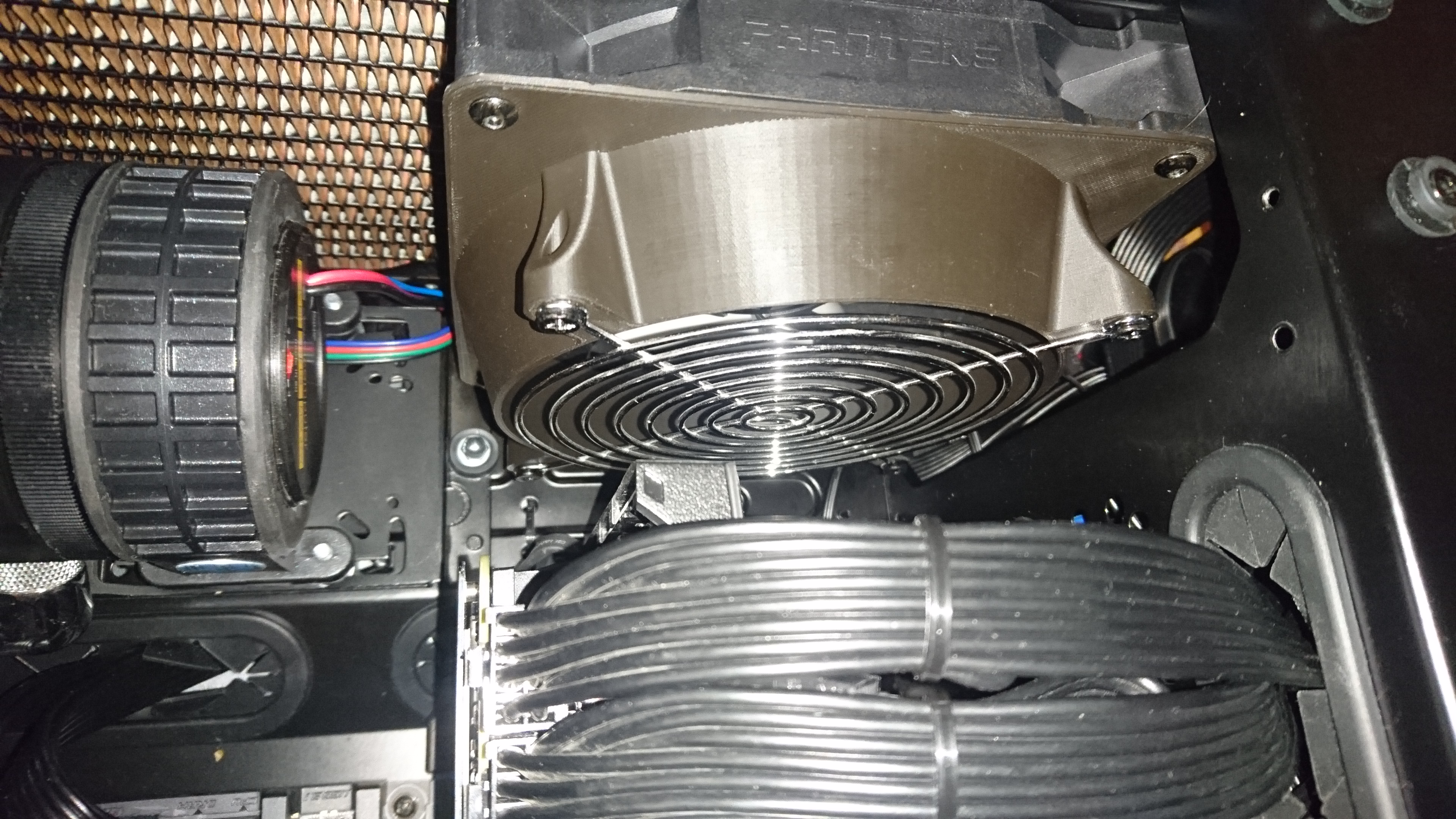 монтаж на радиатор сжо вероятно у него есть приличные 120мм вертушки, которые он не хочет менять а такая "прокладка" между радиатором и вентилятором дополнительно усиливает давление воздуха, что благоприятно сказывается на температурах