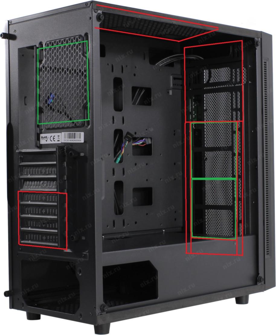 На обведенные зеленым места поставить 120-ки, где красное - чем-то заклеить. В самом верху будут мешать провода, там как получится. Передний нижний сориентировать так, чтобы немного воздуха попадало на жесткие диски, он должен крутиться на 1200 оборотов, средний 900, задний тоже 900. Крышу заклеить полностью, иначе в простое через нее будет падать пыль.