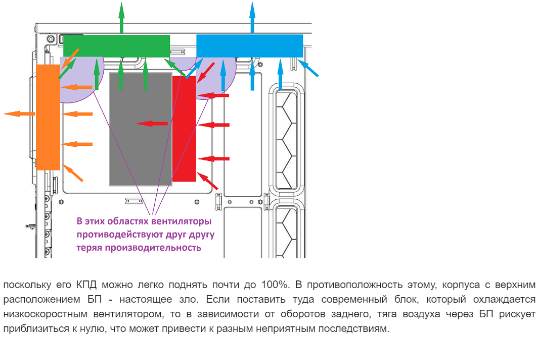 Karats две стрелки вверху? а чего перечеркнули? там же нет экрана ограждающего потоки воздуха по перечеркнутым стрелкам, верхний задний вентилятор часть воздуха все равно "отбирает" у процессорного, вот чтобы процессорный тянул через выдувающий передний конечно под большим сомнением. прошу прощенья, на маленькой картинке не заметил сразу.
