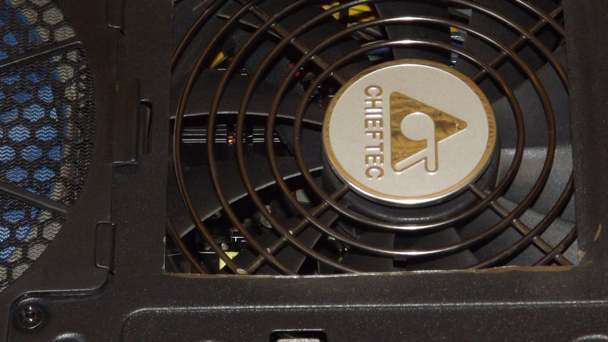 В моём экземпляре наверно 140мм YHS A1425H12S DC12V 0.39A, но пишут были и версии с 135мм Fujifan FJ1352512SH 0.7A в обоих случаях 11 лопастные с прозрачного пластика, а крыльчатка просто крашена под золото (уж лучшеб она была с обычного пластика, он прочнее, а под краской всё равно не видно).
