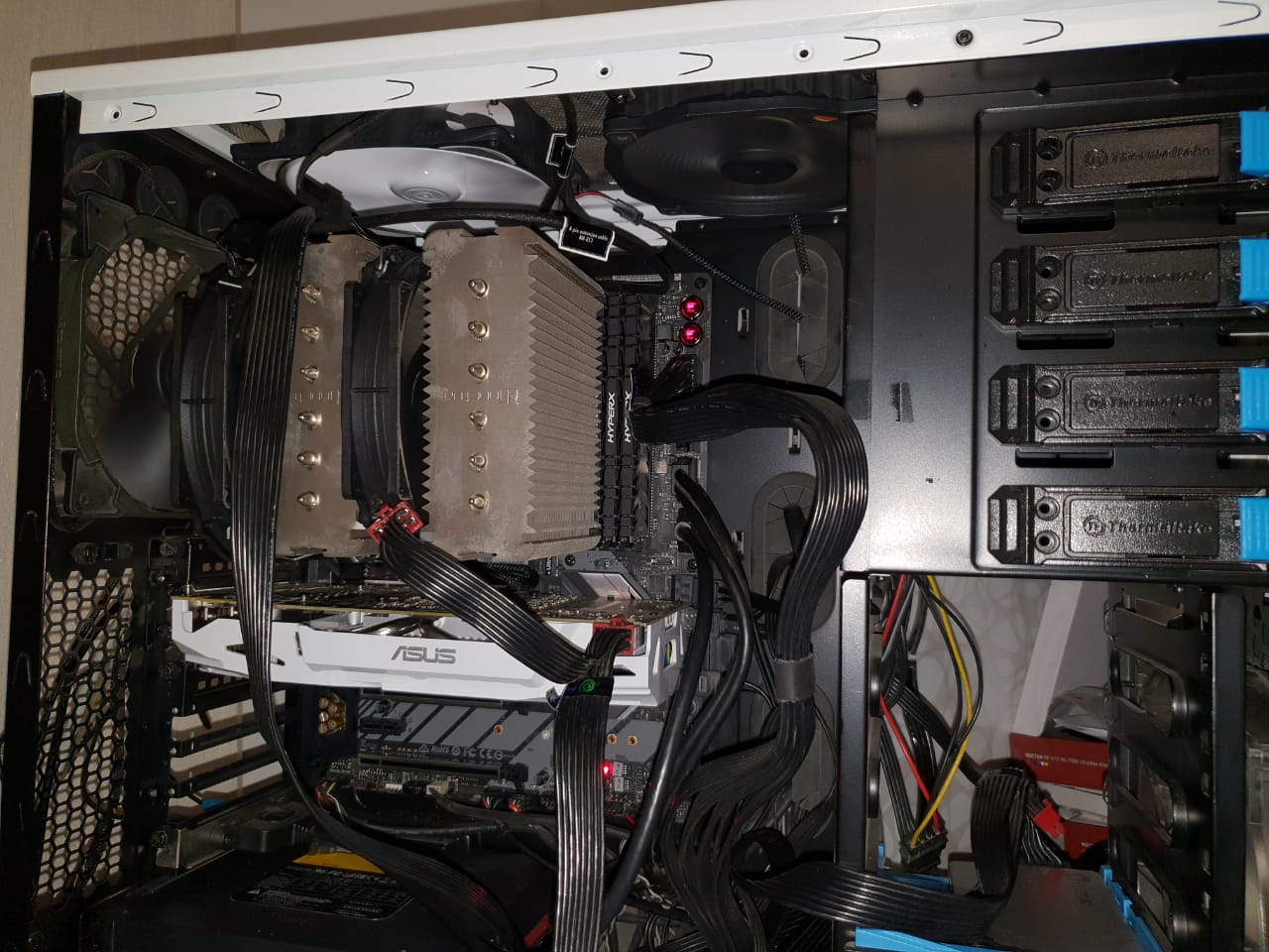 В общем, собираю, вот так пока получается. На выдуве сзади - ураган))) Стоковый вентиль с охлада процессора вниз воткнул на замену старенькому залману, сверху 200 Термалтейк, которая с корпусом шла, тоже заменил на 140 новую - выдув вверх стал более ощутим. Вообще, стоковые 200 корпусные не очень, вялые.