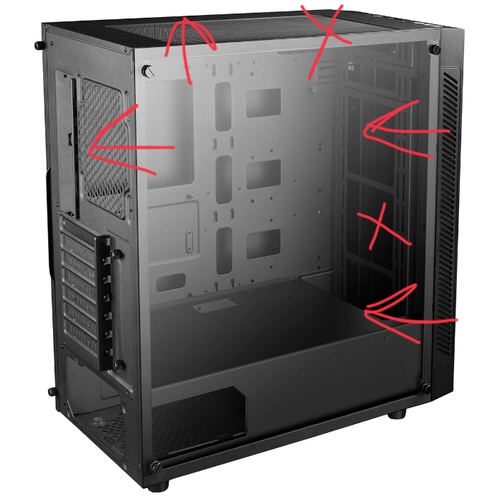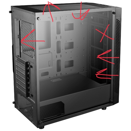 В общем по советам накидал вариантов. Я без понятия откуда вы берете красивые схемы, поэтому я вот так наколхозил. Какие варианты сразу в топку? Больше всего меня почему-то заинтересовали варианты в теме когда верхнюю часть глушат (тк пыль задолбала реально), но не знаю насколько это применимо к моему корпусу и будет ли профит. Заранее извиняюсь за то что не смотря на советы ранее все равно еще спрашиваю, но мне хотелось бы максимально отсечь все лишние варианты, ибо корпус из г*вна сделан и туда сюда крутить вентили такое себе удовольствие